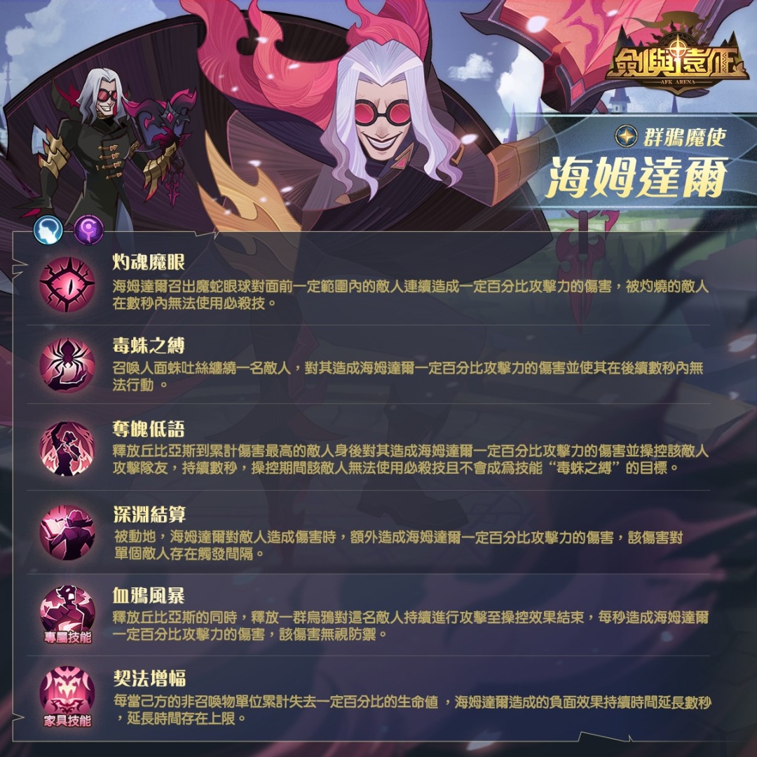 卡牌放置手遊《劍與遠征》全新耀光法師『群鴉魔使-海姆達爾』現身。海姆達爾擅長控制技能,可以釋放召喚物封鎖敵軍必殺技,限制對手行動,甚至操控敵人。玩家能善用海姆達爾強大的控場能力,開發全新戰術與陣容,讓對手臣服於黑魔法的威力之下!