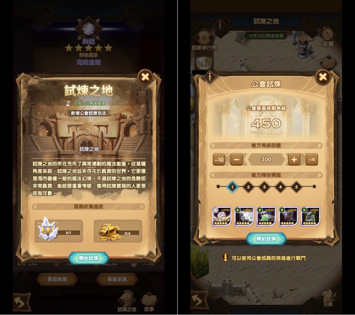 本次改版推出全新遊戲系統「公會試煉」,玩家能在此開發新英雄的致勝陣容搭配,並與公會盟友合力挑戰試煉,贏得通關獎勵。公會試煉的敵軍等級可由玩家任意調整,擊敗高難度的敵軍,就有機會幫你所屬的公會登上排行榜,領取更多活動獎勵。