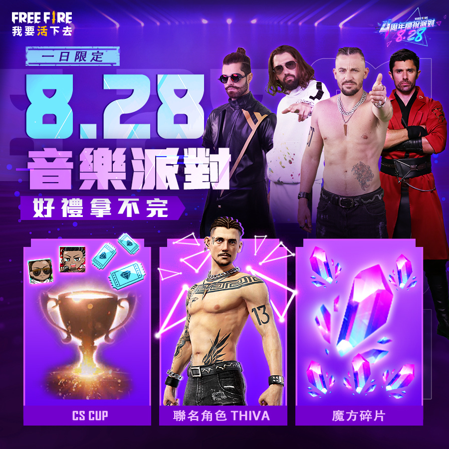 4 週年限定任務將於 8 月 21 日至 9 月 5 日開放,同時,遊戲也將更換為 4 週年專屬大廳。立即登入遊戲,接受 DJ 的邀請即可領取登入獎勵及週年慶禮物。每日任務、記憶拼圖、碎片轉蛋、角色合照紀錄集以及週年測驗等各式活動也同步登場。8 月 28 日登入即可獲得聯名角色 Thiva。更多資訊歡迎持續關注 Free Fire 官方粉絲團以獲得 4 週年慶的最新消息。