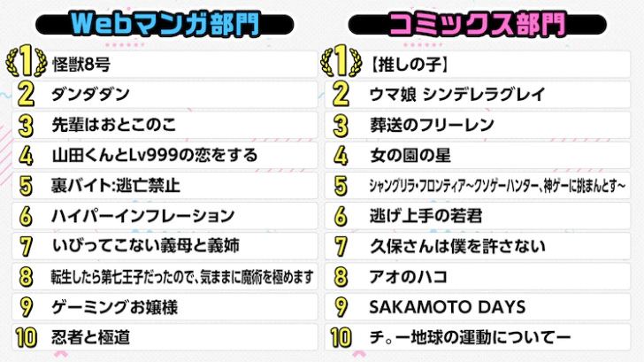 赤坂アカx 横槍萌果《我推的孩子》描述在宮崎縣鄉下地方擔任婦產科醫生的五郎(ゴロー) 因為某件事情而殞命,當他又回復意識的時候,發現自己轉生成自推偶像的孩子。目前本作在週刊 Young JUMP 連載中,單行本推出五集。漫畫獎項第二名則是 Cygames 的多媒體作品《賽馬娘 Pretty Derby》的延伸漫畫《賽馬娘 仙杜瑞拉(ウマ娘 シンデレラグレイ)》,由久助太陽繪製,劇本是擔任動畫劇本統籌的杉浦理史、動畫製作人伊藤隼之介。第三名也是今年的大熱門作品《葬送的芙麗蓮》。