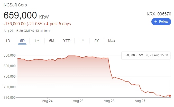 韓國 NCsoft 開發並自 2021 年 8 月 26 日起在韓國手機平台上市的《Blade & Soul 劍靈2》,遊戲自推出不但沒後讓 NCsoft 股票大漲一波,反而讓 NCsoft 股價在過去 5 天內暴跌 21%。