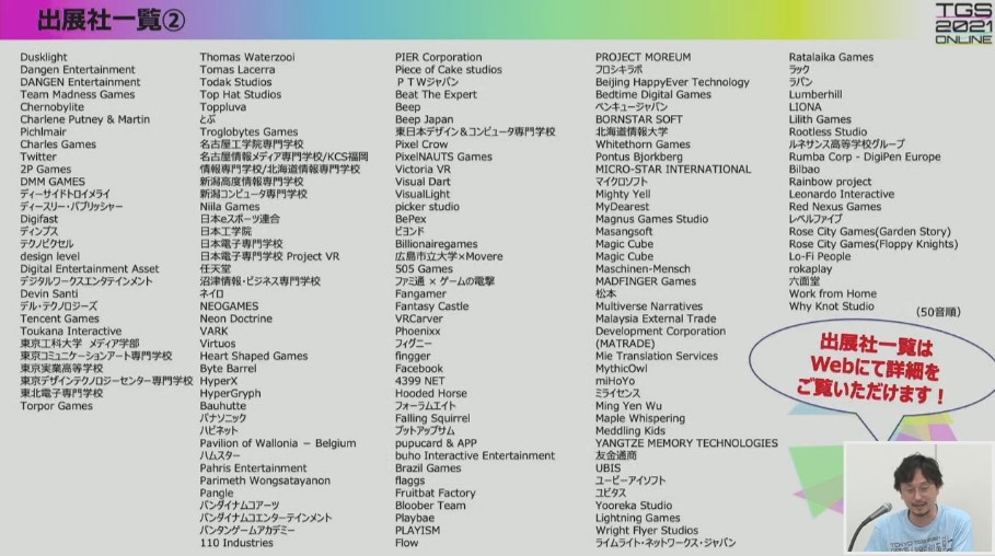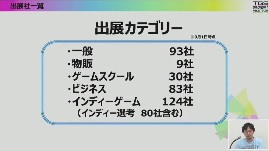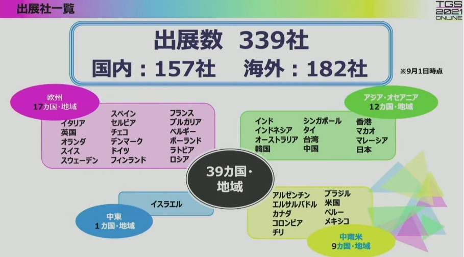 至於在本次的參展廠商部分,目前累計參展廠商數量 339 家,其中日本 157 家、海外(含歐美、亞洲、中東、中南美等 39 個國家.地區)182 家。至於在參展廠商類型方面,將會分成一般向(93 家)、商品販售(9 家)、遊戲學校(30 家)、商務(83 家)、獨立遊戲(124 家)等類型,詳細參展廠商名稱,玩家可參照官網公開資訊確認。