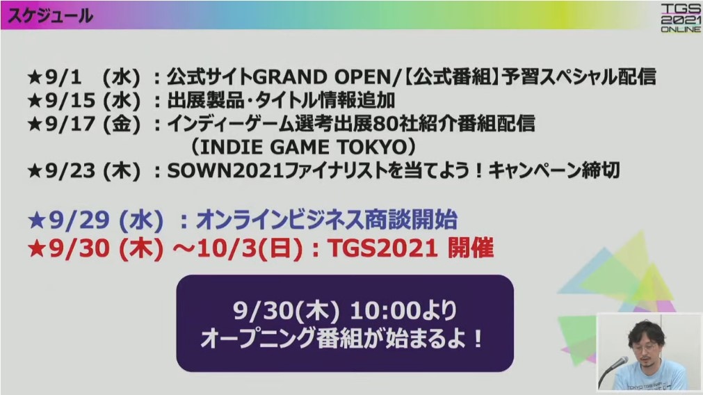 官方也預告,除了今天的預習特別節目外,接下來在 9 月 15 日還將會公開追加參展作品情報;並於 9 月 17 日推出獨立遊戲選考出展 80 家廠商的介紹節目;另外自日本時間 9 月 30 日 10:00(台灣時間 09:00),開幕節目正式公開,玩家們到時萬勿錯過!