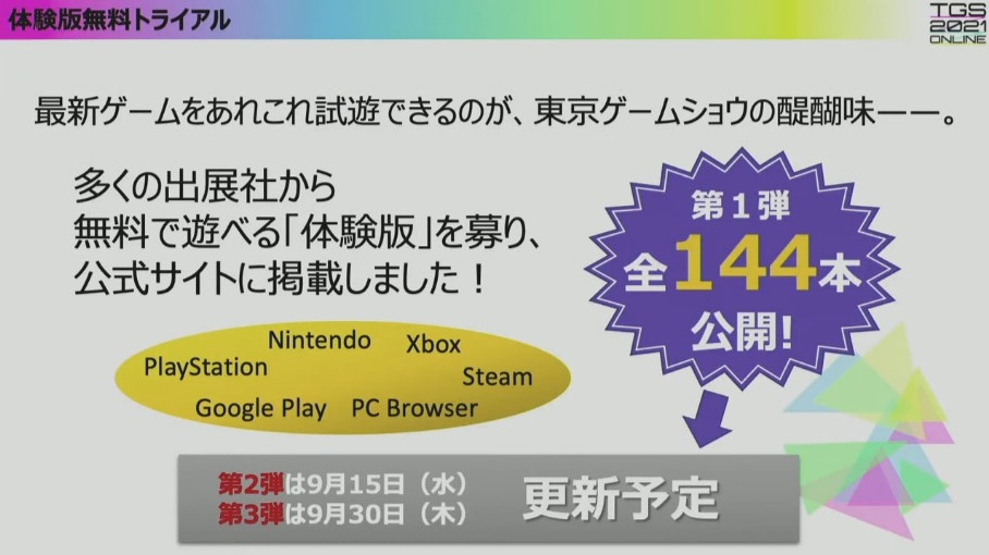 而在這次新追加的體驗版免費遊戲試玩方面,一直以來能在東京電玩展試玩體驗各種最新遊戲,向來都是東京電玩展最大的醍醐味。因此在這次,官方特地從眾多參展廠商整理許多免費體驗版讓玩家們體驗。在首波,就有 144 款將會開放試玩,接下來在 9 月 15 日與 9 月 30 日還將會陸續更新更多免費體驗遊戲與玩家分享。