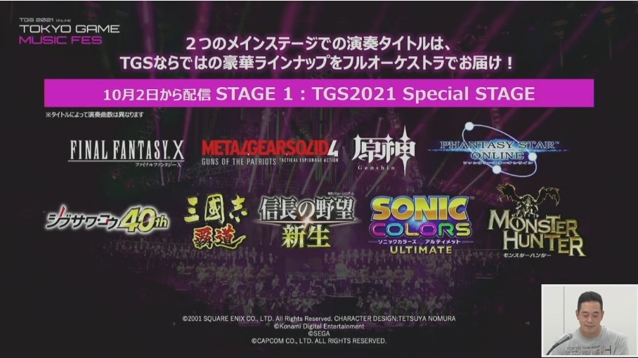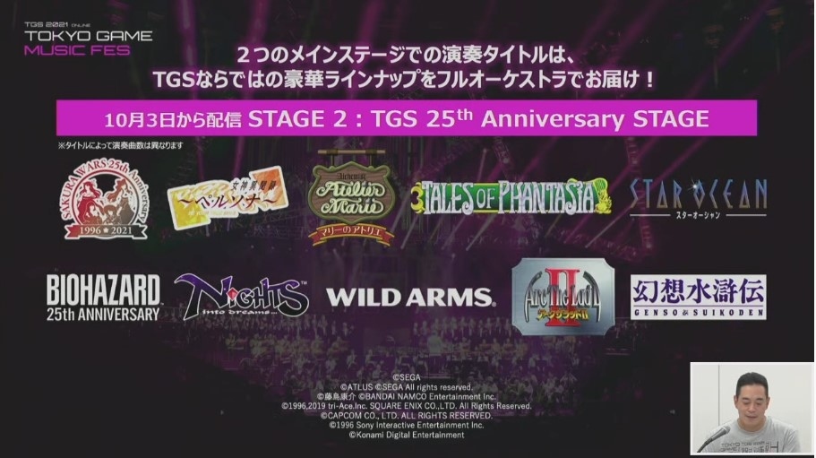 另外在這次的 TGS 音樂祭方面,這是為了慶祝 TGS 25 周年紀念而推出的線上音樂祭活動(入場券將從今天開始販售)。在這次的音樂祭中,將會分成兩個主舞台,其中 10 月 2 日開始推出的舞台 1 中將會收錄包括《FF X》、《原神》、《PSO 夢幻之星網路版》、《三國志霸道》、《信長之野望 新生》、《魔物獵人》等作品樂曲演奏;至於 10 月 3 日的舞台 2 則是會有《惡靈古堡》、《星海遊俠》、《幻想水滸傳》、《亞克傳承2》、《女神異聞錄》、《飛天幽夢》、《狂野歷險》等多款人氣遊戲樂曲與玩家一起同樂。