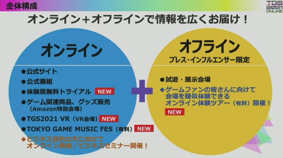 如上所述,這次 TGS 2021 將會採線上線下同步展開方式進行。其中在線上部分,除了官方網站與官方節目、遊戲相關商品/精品販售(會與亞馬遜合作推出線上商城)外,還將會新增體驗版免費試玩、TGS 2021 VR 會場與 TGS 音樂祭(付費)等新內容登場,至於線下部分,主要將會以試玩與展示為主,不過目前主要將會針對媒體與相關人士開放使用,因此一般玩家基本上都會無法參與。