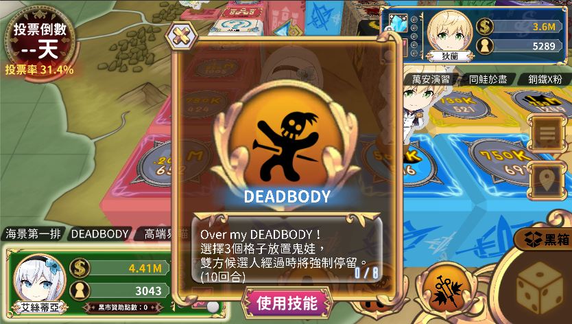 在挑戰模式中,每一名角色都配有不同的專屬技能。團隊在這次的更新中,新增了高端「易瞄」、DEADBODY、消波塊、油電雙掌......等多達 11 項角色專屬技能,玩家不再只有故事模式預設的三種技能可以使用,而是能夠自由搭配技能,運用不同策略來贏得選舉。