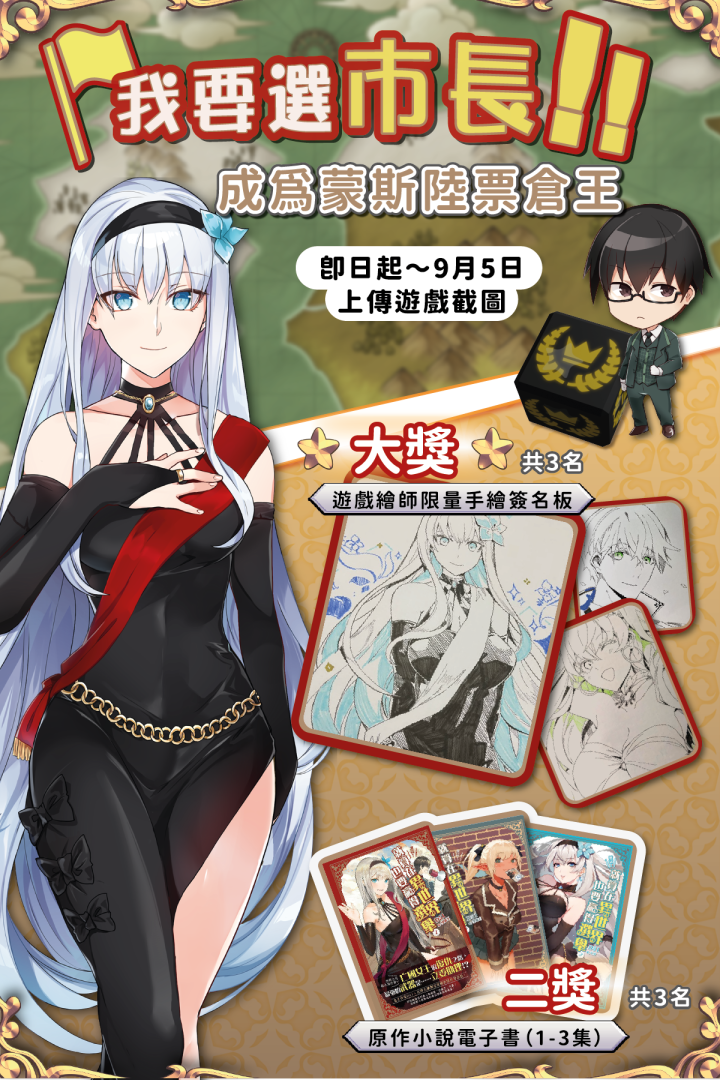 《凍蒜!就算在異世界也要贏得選舉》於 Google Play 及 App Store 上市歷經一個半月後,舉辦了「我要選市長!蒙斯陸票倉王競選大賽」,只要上傳遊戲截圖,就有機會獲得遊戲繪師幽零的限量手繪簽名板和原作輕小說電子書。活動時間至 9/5(日),已進入倒數一週,選舉達人們快來角逐票倉王的寶座吧!