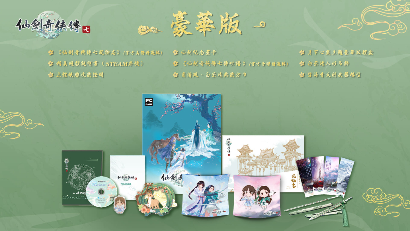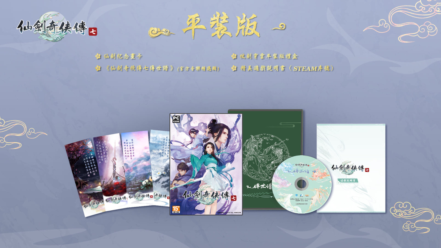 至於在平裝版方面,內容物則是包括仗劍穿雲主題平裝版禮盒、《仙劍奇俠傳七》傳世譜(官方音樂精選輯)、《仙劍》紀念畫卡與遊戲說明書(內含 Steam 序號),玩家可以依照自己的喜好來選擇收購版本,一起體驗《仙劍奇俠傳七》動人的仙俠浪漫冒險。