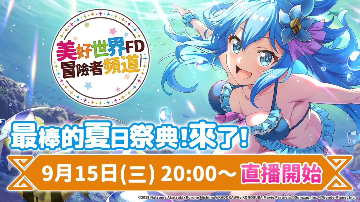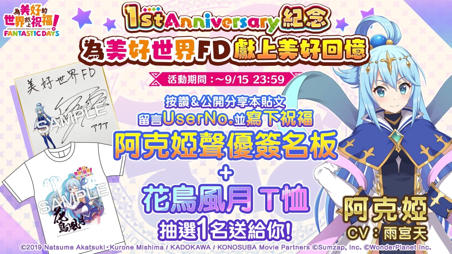 日本 WonderPlanet Inc. 發行及營運,改編自人氣動畫《為美好的世界獻上祝福!》首款手機遊戲《為美好的世界獻上祝福!Fantastic Days》(以下簡稱《美好世界FD》),自本日 2021 年 9 月 9 日(四)起每日追加 1st Anniversary 劇情。同日也將舉辦 1 週年冒險者回歸特別活動與玩家同樂。