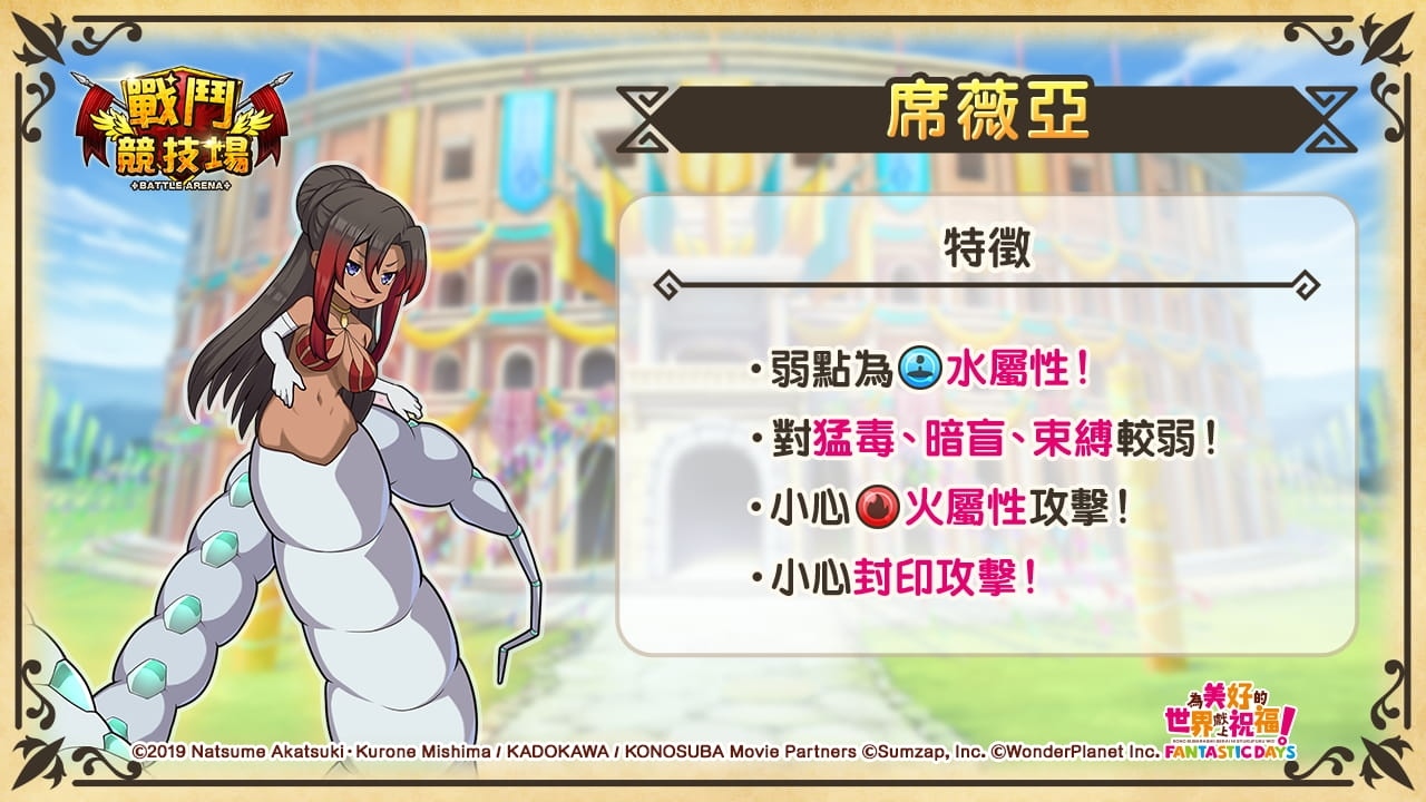 遊戲內 2021 年 8 月 26 日起連續三週舉辦 3 倍獎勵的特選戰鬥競技場!而本次第 3 週登場的敵人為「席薇亞」。針對敵人的弱點來編成隊伍,努力創造高分以獲得滿滿獎勵吧!本次的獎勵增加為 3 倍,請務必把握這次機會獲取大量獎勵喔!
