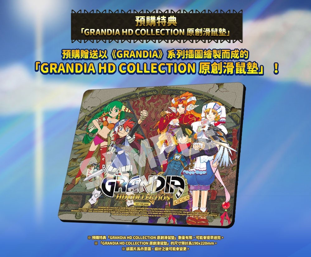 ※預購特典「GRANDIA HD COLLECTION 原創滑鼠墊」與「GRANDIA / GRANDIAⅡ 雙封面」數量有限,可能會提早送完。