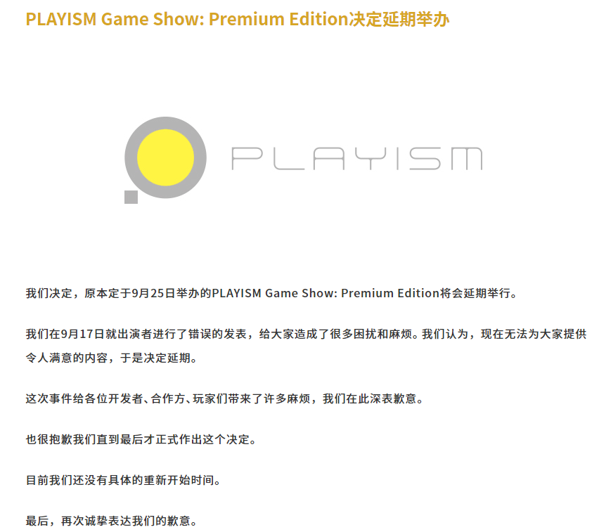PLAYISM 發表新聞稿致歉:「先前宣佈的「PLAYISM Game Show: Premium Edition」已決定延期舉行。由於 9 月 17 日公佈的嘉賓名單出現的錯誤,以及隨後處理此事的不足之處,已造成不少人困擾,在這這個情況下,我們無法提供我們或玩家滿意的內容與活動,對此向參與此事活動的所有開發者與合作夥伴,以及我們所收到的評論與批評的所有人,表示最深切與誠摯的歉意,此外還要向所有期待活動的人道歉,因為公告的突發性以及取消的決定,活動舉辦日期有待定案,一旦正式改期,將提供進一步資訊」