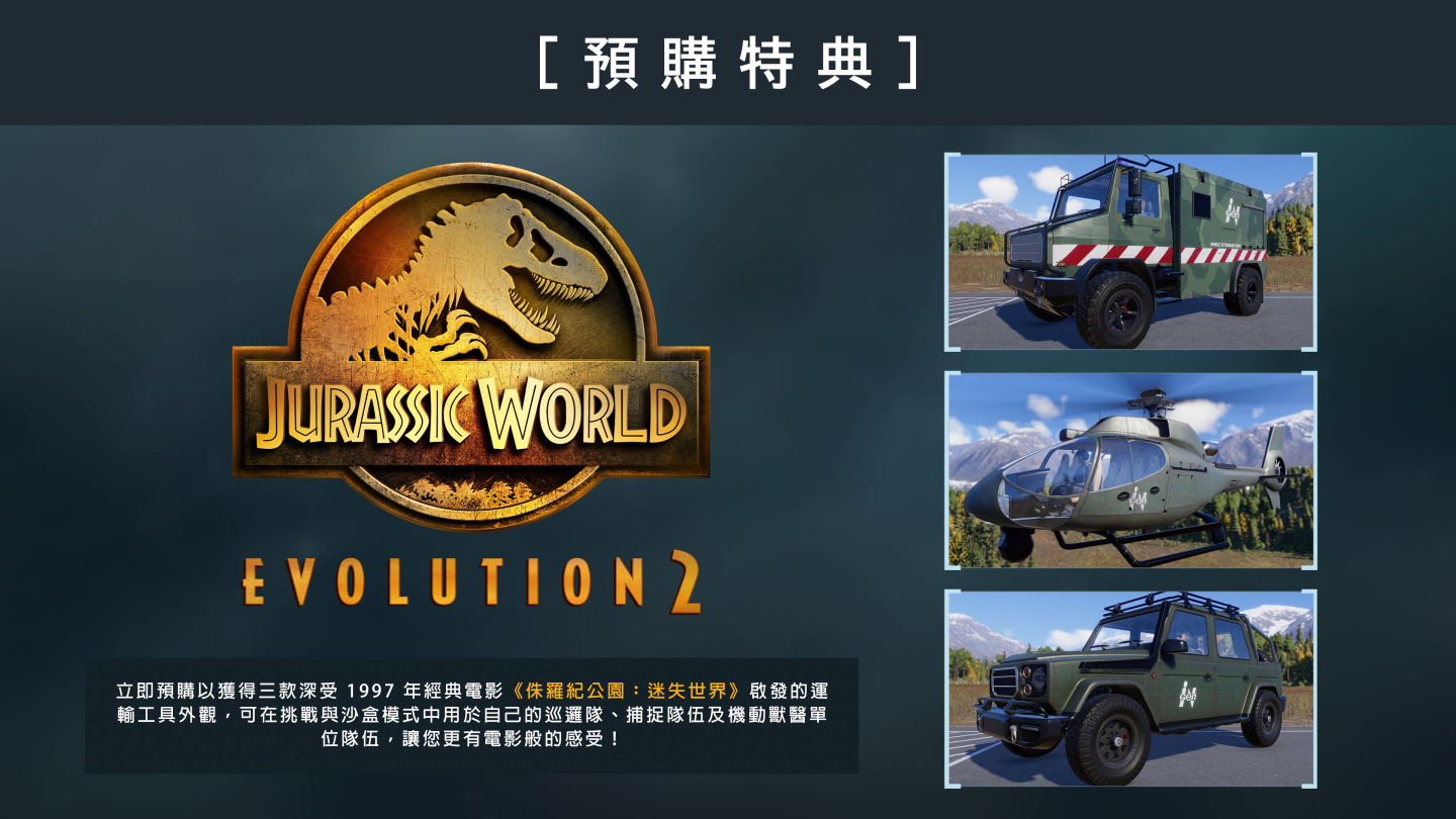由即日起玩家可以預訂《侏羅紀世界︰進化2》,並在正式推出時獲得三項令人興奮的遊戲內獎勵。受 1997 年驚心動魄的侏羅紀公園續集《侏羅紀公園︰迷失世界》的啟發,該遊戲讓玩家在挑戰和沙盒模式中向約翰哈蒙德的生物工程公司致敬,其中三種車輛外觀帶有標誌性的叢林綠色 InGen 塗裝。