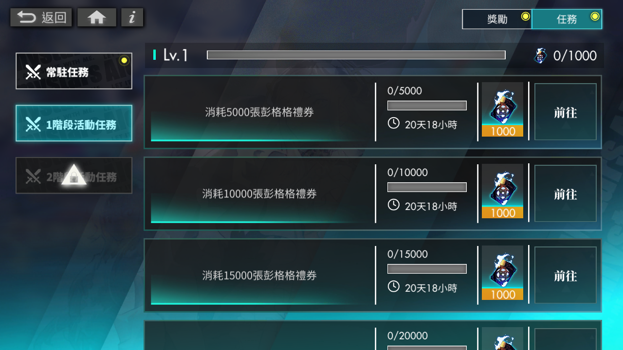 期間內有不同的任務需要達成,像是消耗禮劵或是通過指定關卡等等