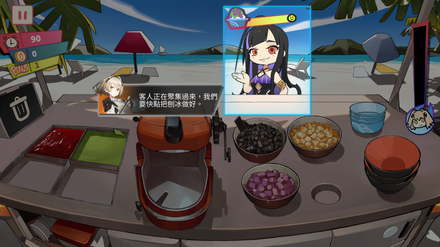 為了在潮汐祭吸引客人的目光,薇絲想到的生意手段就是做刨冰!在這邊進行遊戲時不會消耗任何行動點以及稜鏡,時間內完成越多訂單就可以獲得高積分。想要完成一份刨冰需要選擇份量、配料、醬料、客人的順序進行(醬料與配料的順序不拘),要小心客人等太久是會生氣走人的,盡早給他正確的東西就可以得到高評分,隨著累積完成的訂單越多就會觸發「刨冰之魂」時刻,只要點選畫面任意位置就可以自動進行訂單的每個步驟快速增加積分喔,對自己的送餐速度有信心的領航員們不妨來挑戰緊張刺激的刨冰製作過程,要注意的是特別事件簿裡面有任務跟刨冰積分有關,等待行動點或稜鏡回復時就來做刨冰打發時間吧!