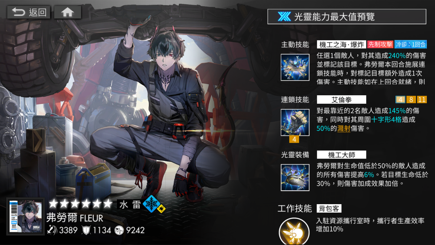 六星光靈,在成員大多屬於直率奔放的紅油扳手裡面屬於脾氣溫和的技術人員,對於修理機械十分擅長;覺醒程度到達最高後會開啟雷的副屬性,主動技能「機工之海.爆炸」可以任選一名目標造成傷害後並標記該目標,若該回合施放連鎖技能時,能對目標額外造成一次傷害。