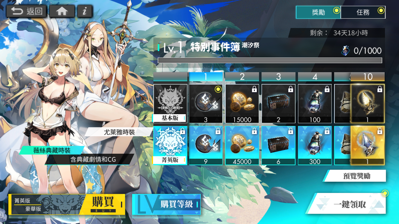 在這邊玩家可以得到許多潮汐祭的獎品,其中包括這次活動正式實裝的光靈時裝造型,無課金的玩家在事件簿等級達到 20 級後可以獲得四星光靈尤萊雅的時裝,想要獲得薇絲典藏時裝的玩家可以考慮購買菁英版解鎖喔!事件簿的任務有分一般的每日活動任務以及階段活動任務,想要填滿整個事件簿就努力完成它吧。