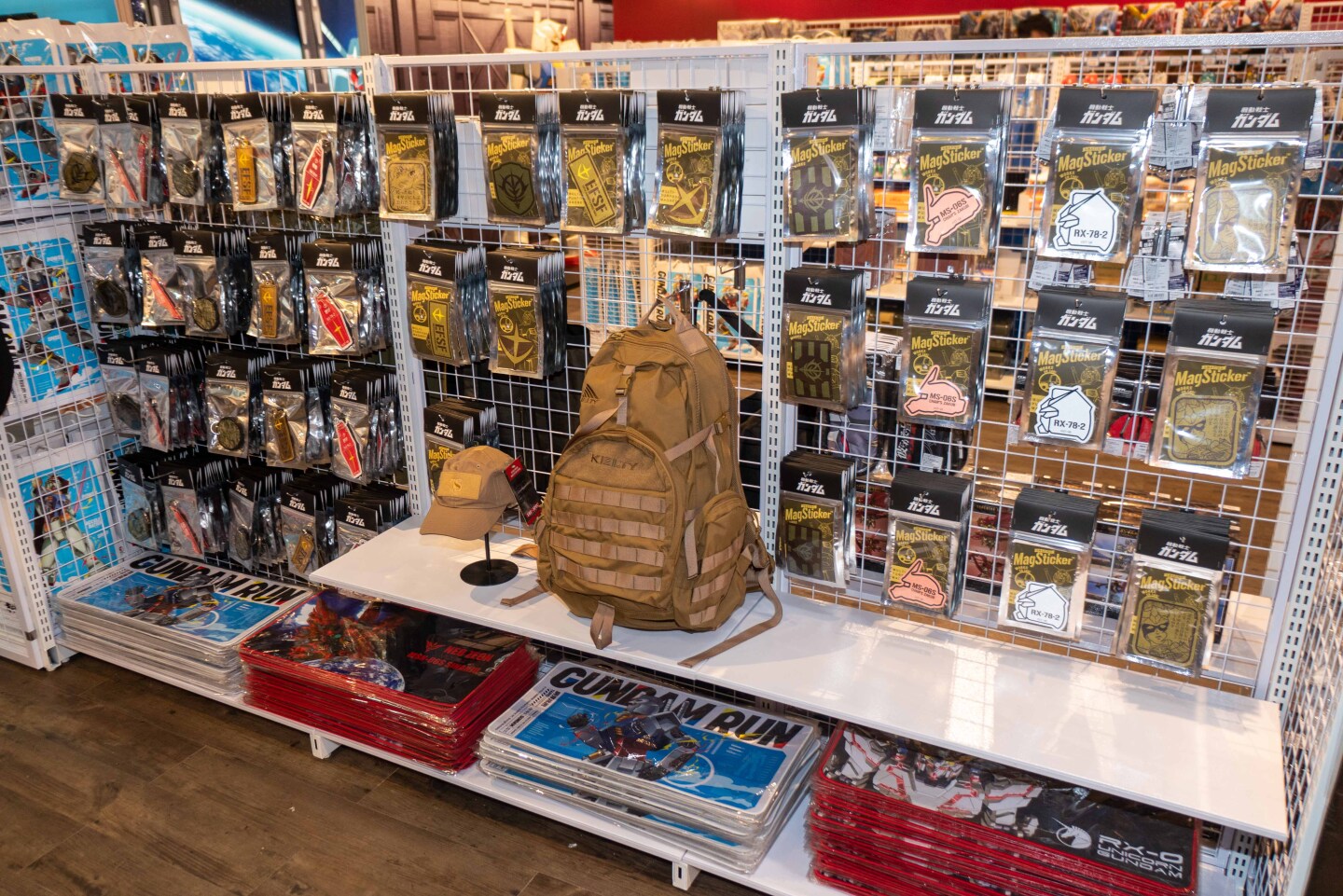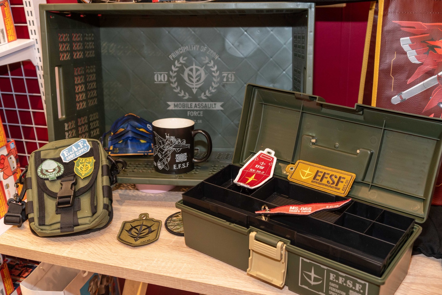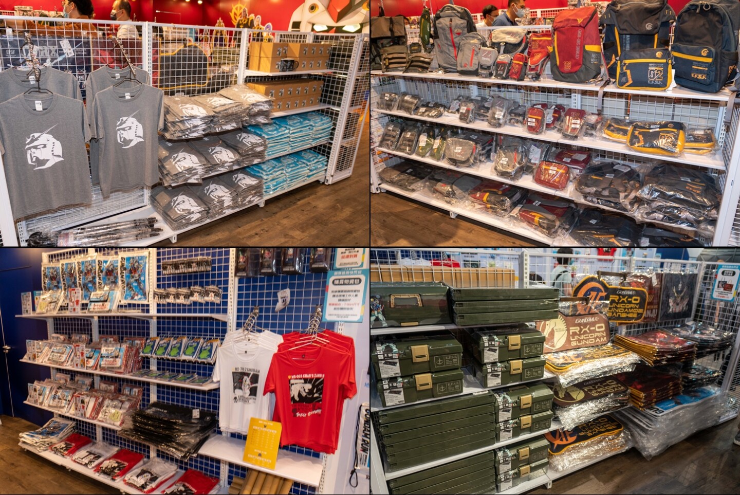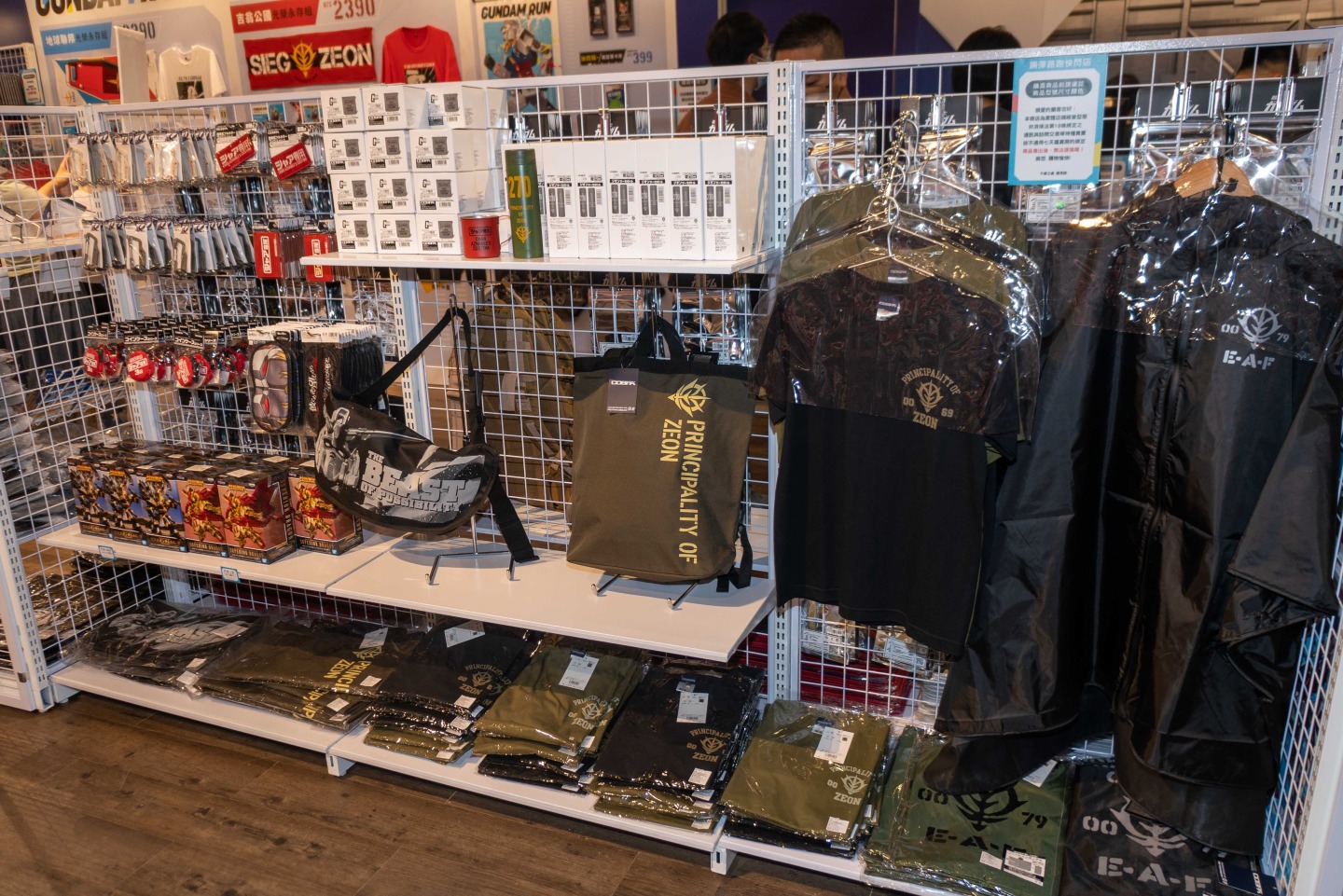 最主要的週邊內容販賣區,包含地球聯邦圖騰的鋼彈連帽緹花毛巾,獨角獸、報喪女妖及鋼彈路跑三款的鋼彈大地墊,鋼彈滑鼠墊、鋼彈馬克杯、地球聯邦+吉翁公國+鋼彈及阿姆羅等八款造型磁貼。