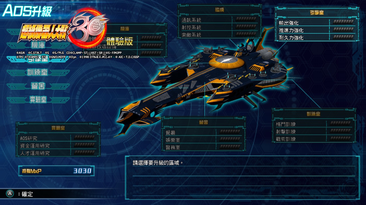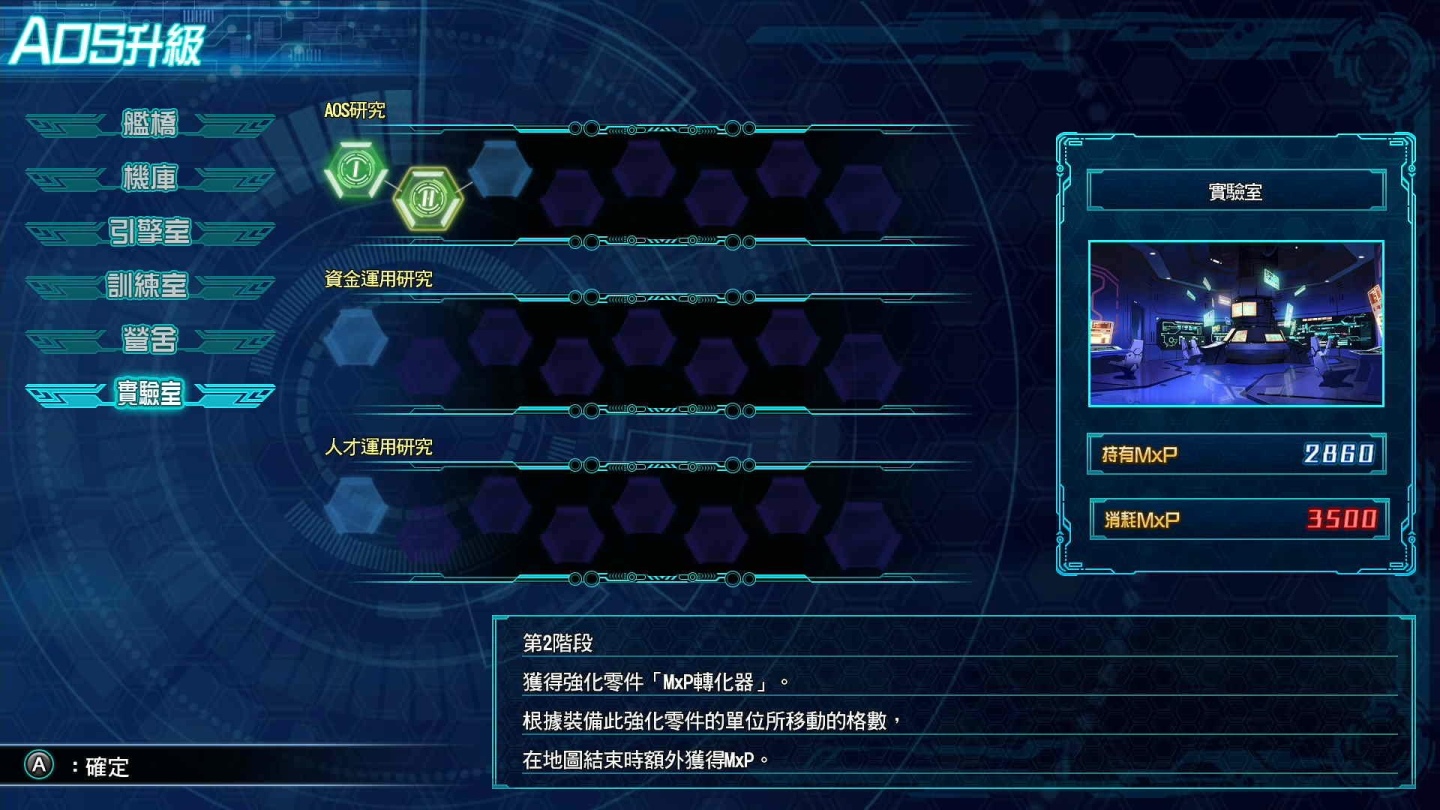附帶一提,雖然這次體驗版只有開放四話劇情,而且沒辦法跟之前系列一樣重複洗關練功,但在 MxP 母艦養成點數的入手方面,卻是有機會可以反覆入手取得。而其中關鍵,就在於 AOS 母艦養成六大主項中的實驗室。在實驗室中的第一項「AOS 研究」的第二階段中,可以拿到強化零件「MxP 轉化器」。這個強化零件的效果,就是會根據移動長度給予額外的 MxP 獎勵。因此玩家只要讓某隻高移動性機體裝備該項強化零件,就可以開始在關卡上跟敵人你追我跑來賺取 MxP 點數……