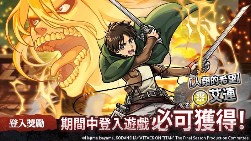 ・透過登入獎勵可獲得UR合作角色「[人類的希望]艾連」!