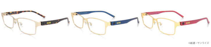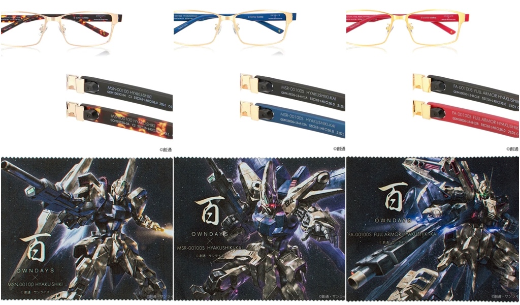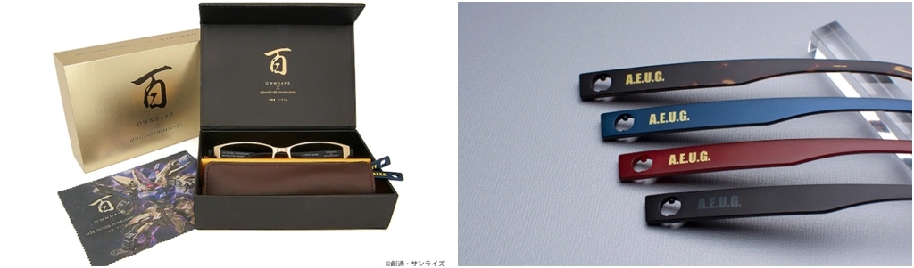 鏡架則設計成可以更換的款式,除了黑色外還有咖啡色、海軍藍、紅色,側面印上「A.E.U.G.」縮寫,耳掛處還有機體編號「MSN-00100」。附上限定專用眼鏡盒及印上機體的眼鏡布,含稅價格包含鏡片費用是 16500 日圓,可在 OWNDAYS 線上商店及日本國內店舖購買。