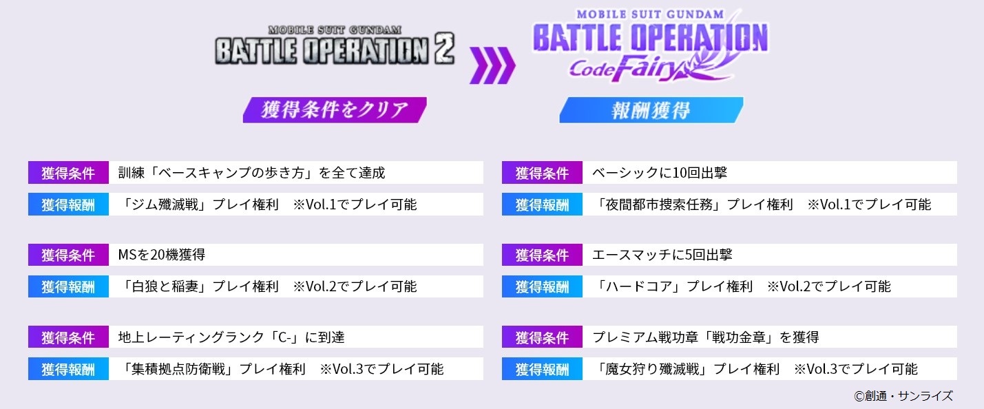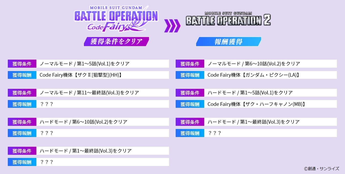 附帶一提,本作也將會支援與《機動戰士鋼彈 激戰任務2》之間的紀錄連動。玩家們只要在本作中滿足特定條件過關,就能夠入手可以在《激戰任務2》中使用的《Code Fairy》的登場機體。同時,如果玩家們在《激戰任務2》中完成特定條件過關,則是可以在《Code Fairy》解鎖新的任務,有興趣的玩家們屆時可以來挑戰看看,獲得更多的內容樂趣體驗。