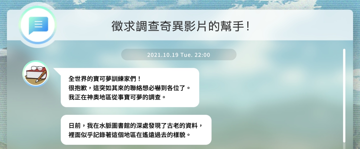 10 月 19 日 22 點,於《寶可夢傳說 阿爾宙斯》官方網站上,一位來自神奧地區從事寶可夢調查的研究員,向全世界的訓練家發出了一封請求協助調查訊息。即刻起訓練家們可將奇異影片內留意到的訊息貼文至自己的 Facebook、Instagram 等社群網路平台,並且註記「#寶可夢調查報告」,和世界各地的訓練家們共同探討,揭開神秘影像的真相!