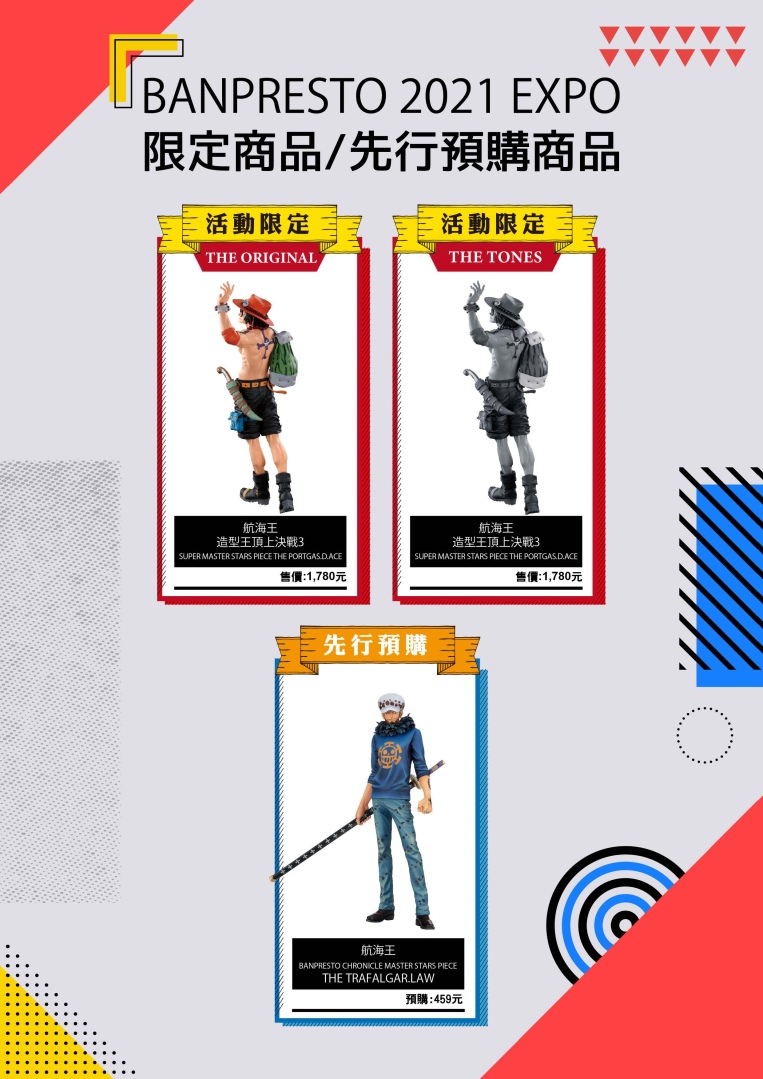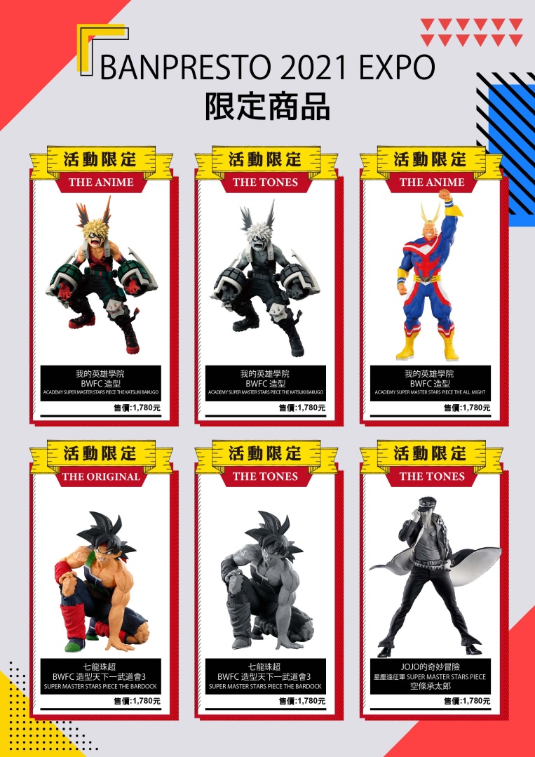 每年展覽期間相當搶手的「會場限定品」,今年推出了讓粉絲已經磨拳擦掌準備開搶的「七龍珠超 BWFC 造型天下一武道會 3」巴達克、「航海王 BWFC 造型王頂上決戰 3」艾斯、「我的英雄學院 BWFC 造形 Academy」爆豪勝己和歐爾麥特,以及「JOJO 的奇妙冒險 星塵鬥士」空條承太郎等多款特殊色造型。「先行預購商品」則是由「航海王 BANPRESTO CHRONICLE 品牌」的羅率先開放預購。