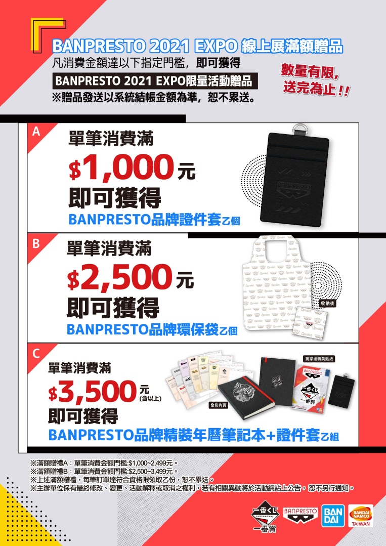 今年全數商品皆直接於蝦皮購物開設活動專區商城,準時開賣,讓各地的粉絲都能安心購買,凡於活動期間購買商品(不含限定品、先行販售品)單筆消費滿 1000~2499 元,即可獲得 BANPRESTO 品牌證件套;單筆消費滿 2500~3499 元,即可獲得 BANPRESTO 品牌環保收納袋;單筆消費滿 3500 元(含以上),即可獲得 BANPRESTO 品牌精裝年曆筆記本和品牌證件套乙組。贈品數量有限送完為止,歡迎粉絲收藏。