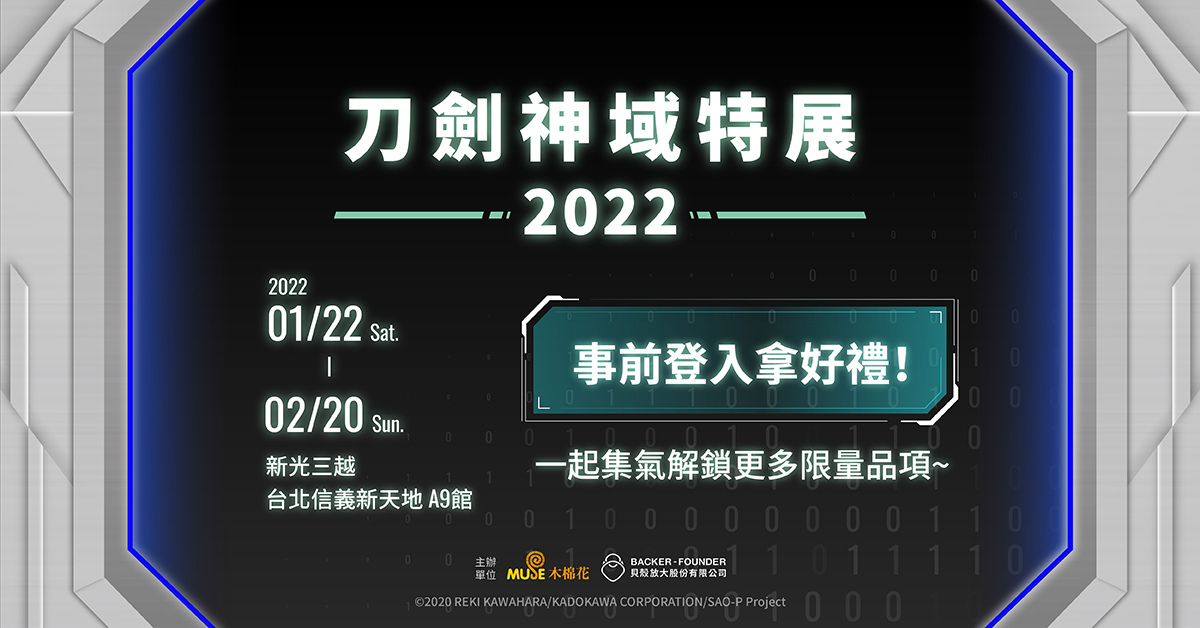 為迎接小說設定中「刀劍神域」這款遊戲問世的 2022 年,同時紀念《刀劍神域》十周年,即將於 1/22 於新光三越台北信義新天地 A9 館舉辦《刀劍神域》特展,預計回顧作品的各個歷程,並預備主要角色模型、公開劇場版角色設計設定圖稿、與重要武器等,同時規劃經典場景的大尺寸投影,讓粉絲重溫 SAO(Sword Art Online)、ALO(ALfheim Online)、GGO(Gun Gale Online)、UW(Alicization War of Underworld)等篇章的遊戲世界壯麗風景。並設置互動體驗區,包含大型扭蛋、趣味競賽等,帶粉絲重溫《刀劍神域》十年間帶給觀眾的感動。即日起粉絲們就能預先登入「2022 刀劍神域特展」活動網站(https://sao-sp.tw/)參加抽獎,網站中還有考驗鐵粉程度的「信仰值大考驗」、鍵入關鍵字還能領取神秘彩蛋,歡迎粉絲與好友集氣解鎖更多展覽活動!
