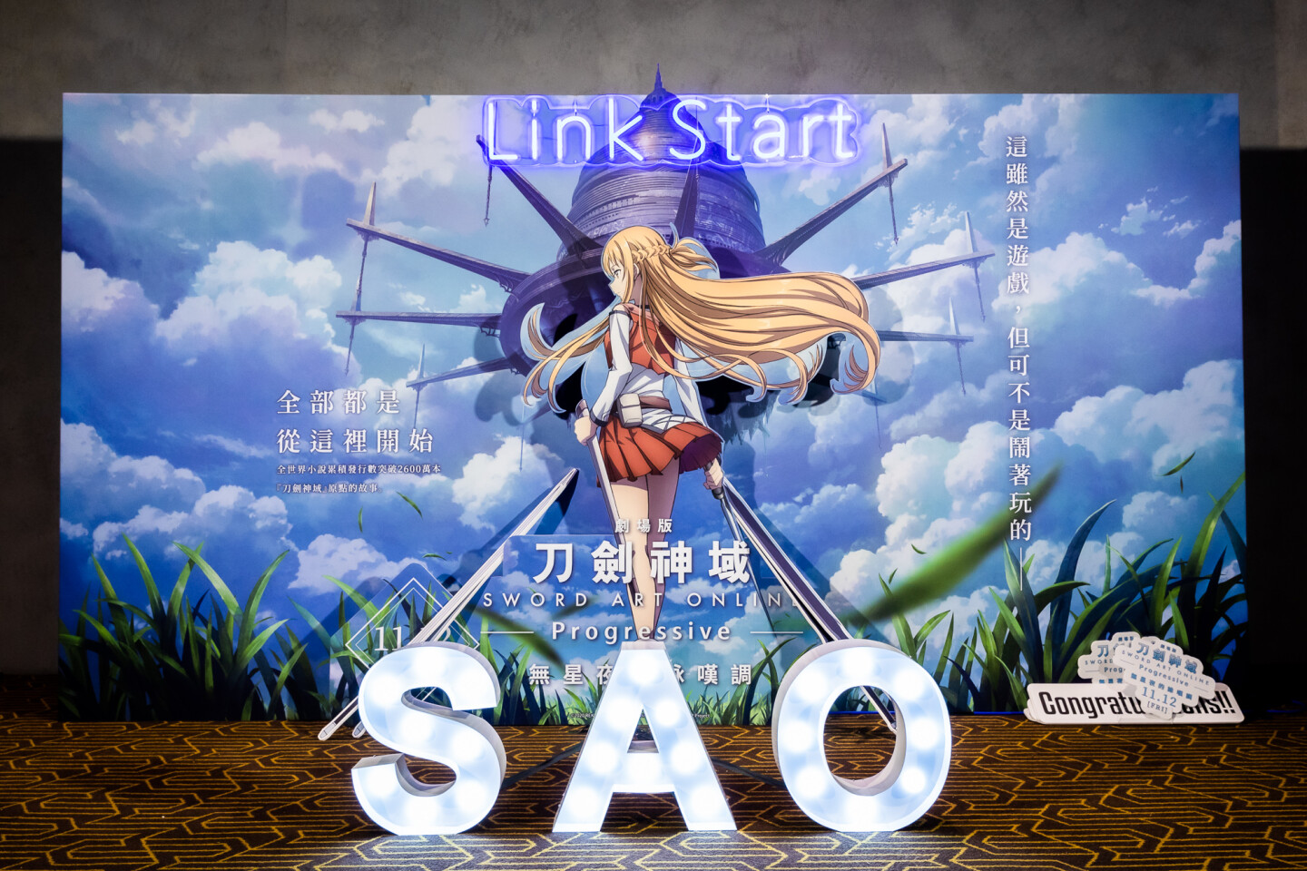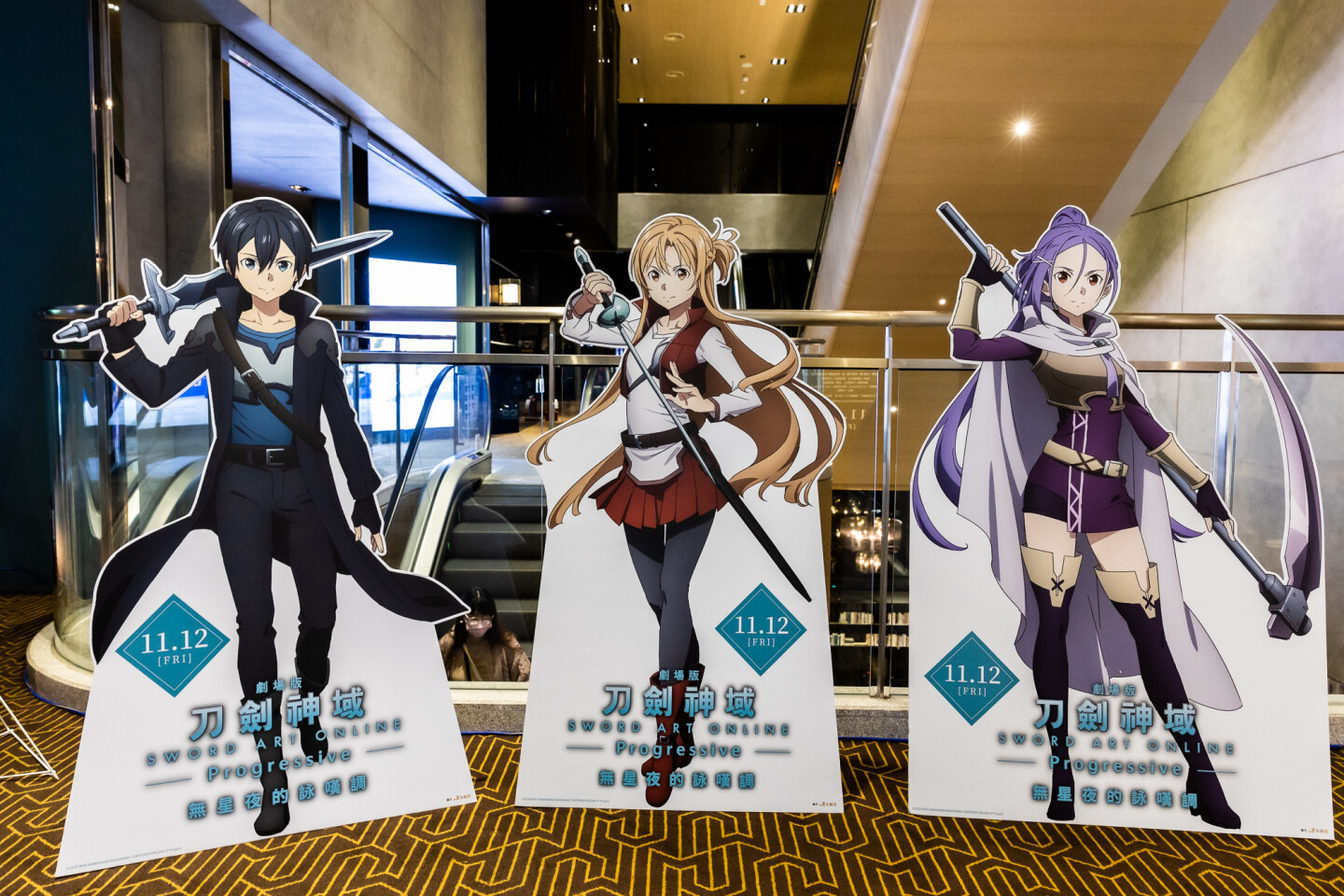 特映會現場內可看到本片主角「亞絲娜」與「艾恩葛朗特」為主的雙層合影區,象徵著亞絲娜視角中沉重高聳的鋼鐵城「艾恩葛朗特」,與電影場景連結的劇情介紹牆,本片主角群「桐人」、「亞絲娜」、「米特」等人都現身迎賓,現場可以重溫男女主角第一季的裝扮,電影新角色「米特」的武器是少見的巨大鐮刀,一身神秘紫的裝束,她與亞絲娜的關係讓人好奇;人稱「黑色劍士」的男主角桐人,也回歸成擁有絕技前的型態,此時他擁有的資訊量就注定為這場生存戰肩負著不可小覷的使命,但是難以與人親近的他,是如何與亞絲娜相遇?在電影中也同樣令人期待。