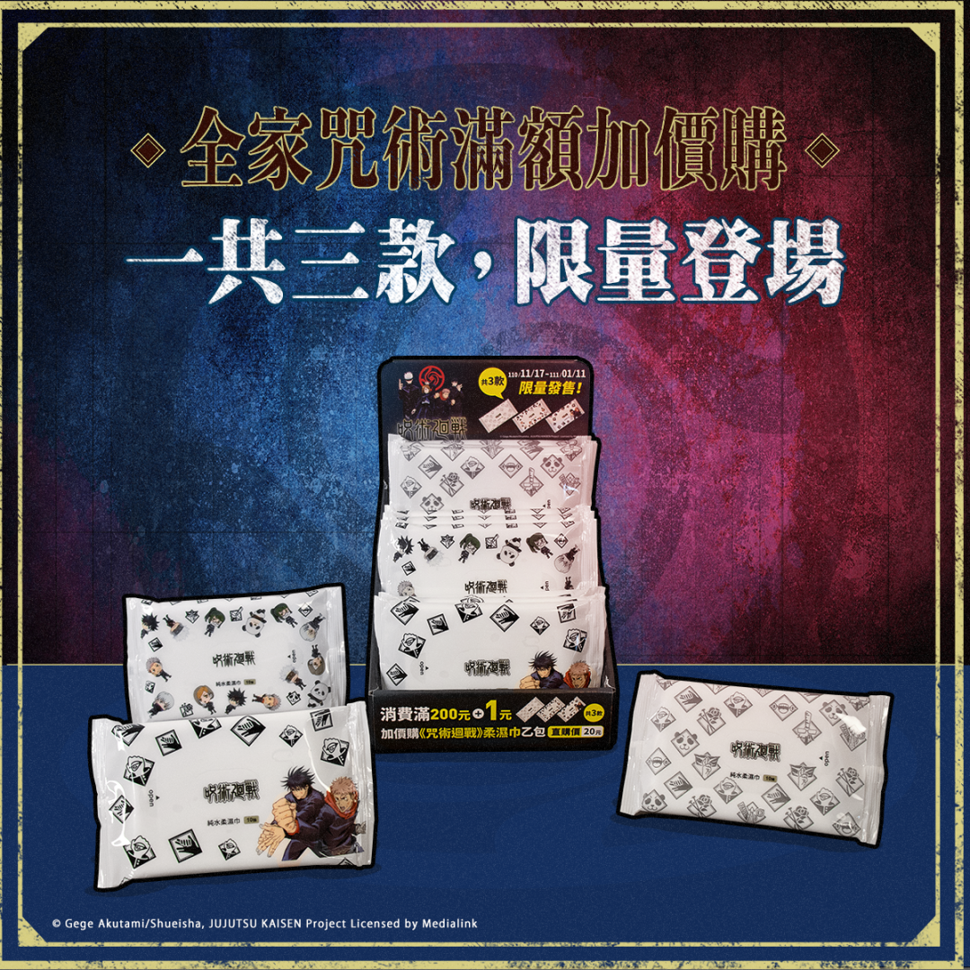 《咒術迴戰》以性格鮮明討喜的角色和節奏明快帥氣的打鬥場面讓無數粉絲熱血沸騰,動畫在串流平台上架短短幾天,即衝上台灣排行榜第一名。現在《咒術迴戰》與全家便利商店首波聯名集點加價購活動,推出一系列實用的生活用品,包含手提袋、側背包、馬克杯,即日起~12/14 可使用點數加價換購。更推出三款包裝的濕紙巾,讓你隨身攜帶清潔,消費滿額只要 +1 元就可獲得。