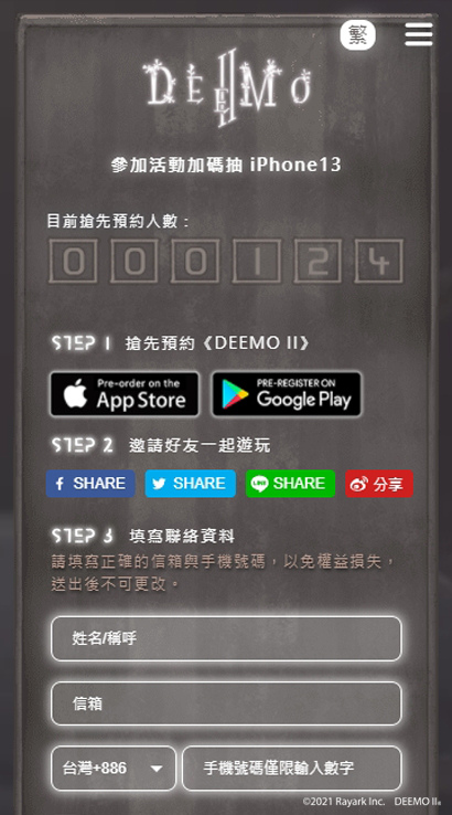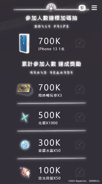 多首《DEEMO II》曲目都將在此期間首度公開,完成測驗即可搶先聆聽。事前登錄活動累積人數越多,全球玩家將可獲得「限時暢玩券」等大量超值獎勵。官方更宣布全球預約人數達 70 萬,將加碼抽出一名玩家贈送 iPhone13 一台。