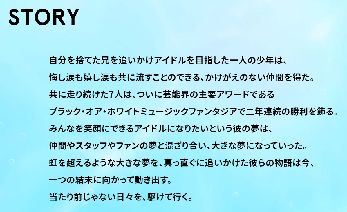 他們為了眾人的笑容而成為偶像的夢想,加上夥伴和工作人員以及粉絲們的夢想,變成了一個遠大的目標