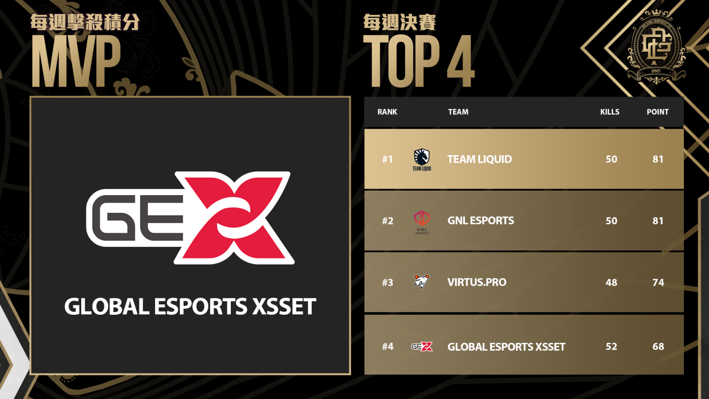 來到 PGC 世界賽中段的第二週,發生許多出乎意料的反轉劇情,首先多支奪冠熱門候補沒能晉級第二週決賽,其中包括前後世界冠軍 Gen.G 和 Soniqs、歐美勁旅 FaZe Clan、TSM以及 Oath,甚至第一週冠軍 KPI Gaming 也被排除在外。反觀第一週表現不盡理想的中國賽區,除了MCG戰隊穩定發揮,NewHappy和PERO 恢復水準,雙雙晉級至第二週決賽。然而,第二週最大驚喜當屬台港澳賽區的 Global Esports Xsset (GEX),除了成功打進週決賽之外,更在決賽第一天,高居 16 支隊伍之冠,儘管未能延續氣勢拿下週決賽冠軍,以第四名成績收尾,不過爆發性的表現,GEX 絕對堪稱第二週決賽最大焦點!