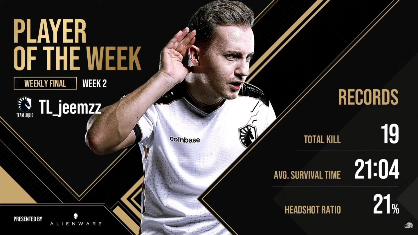第二週冠軍由全球人氣與實力兼具的電競俱樂部– Team Liquid(TL) 拿下,同時晉級至總決賽。靠著陣中顏值擔當jeemzz的穩定發揮,帶領這匹馳騁歐洲的戰馬斬獲兩次吃雞,並團隊有著 50 分的亮眼擊殺數,儘管總積分 81 分跟韓國 GNL Esports 同分,卻以2次的吃雞數領先,進而收下週冠軍,jeemzz更獲選第二週最佳選手 (Play of the week,簡稱 POTW)。