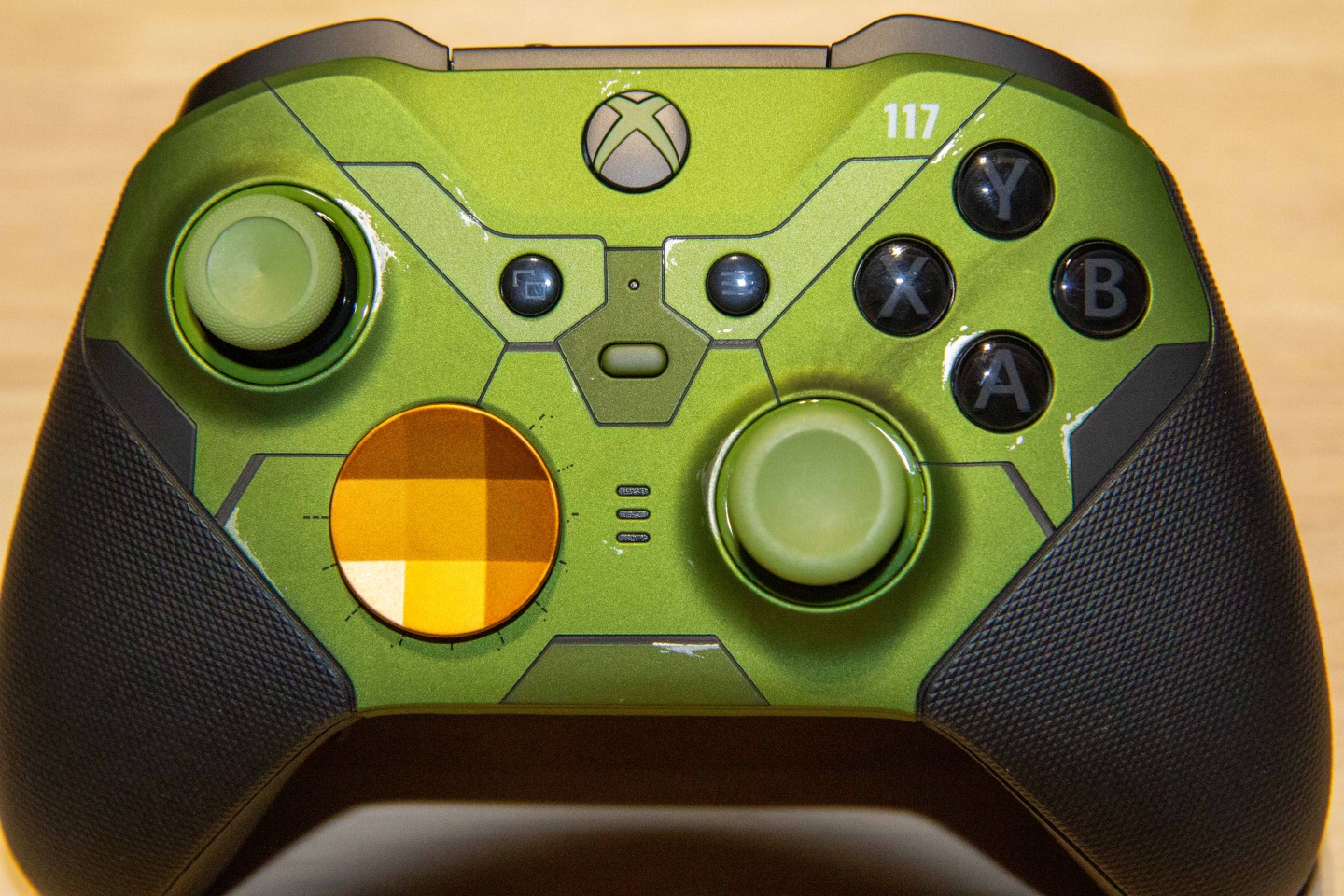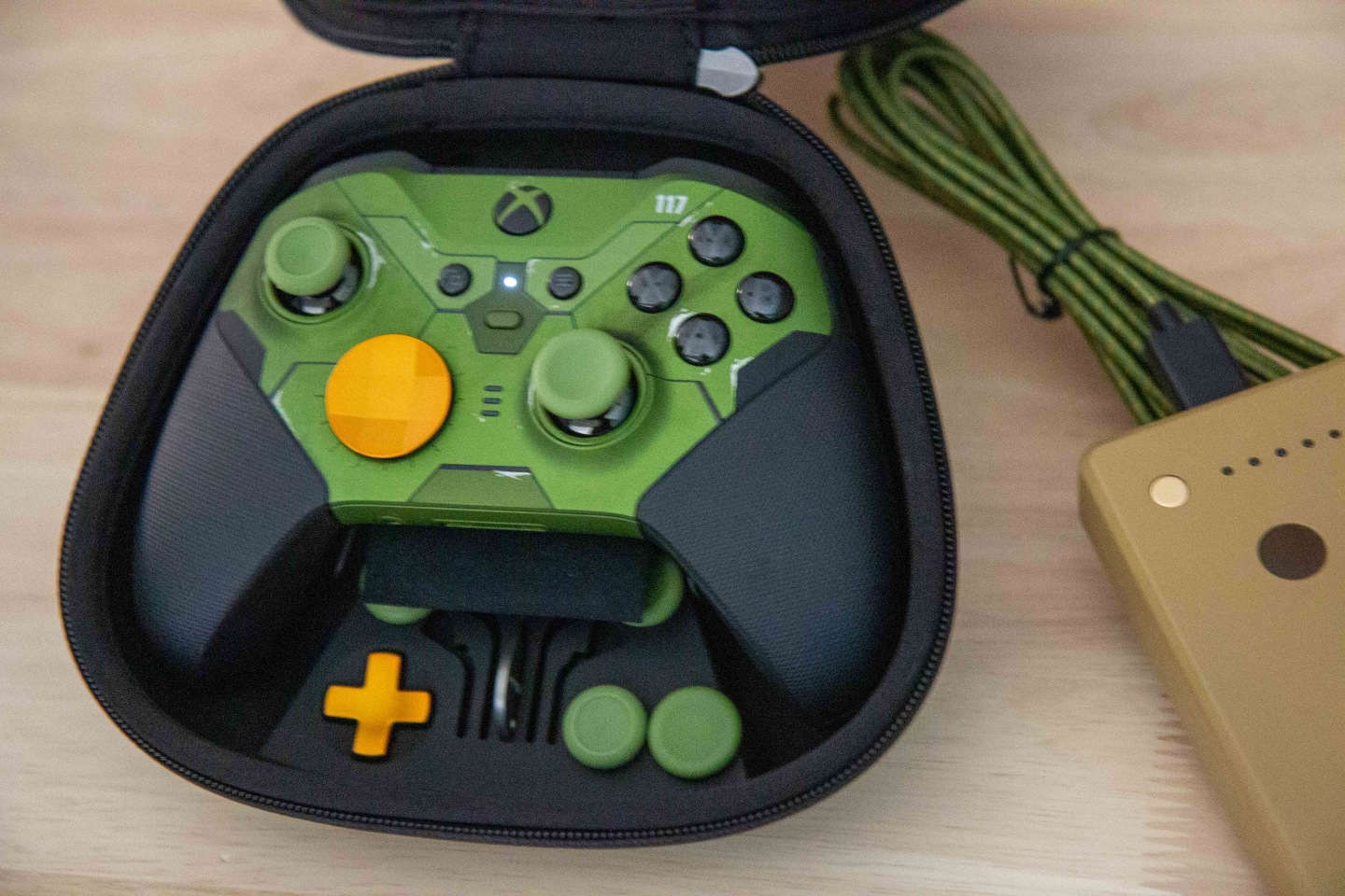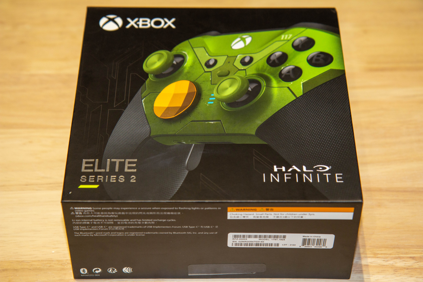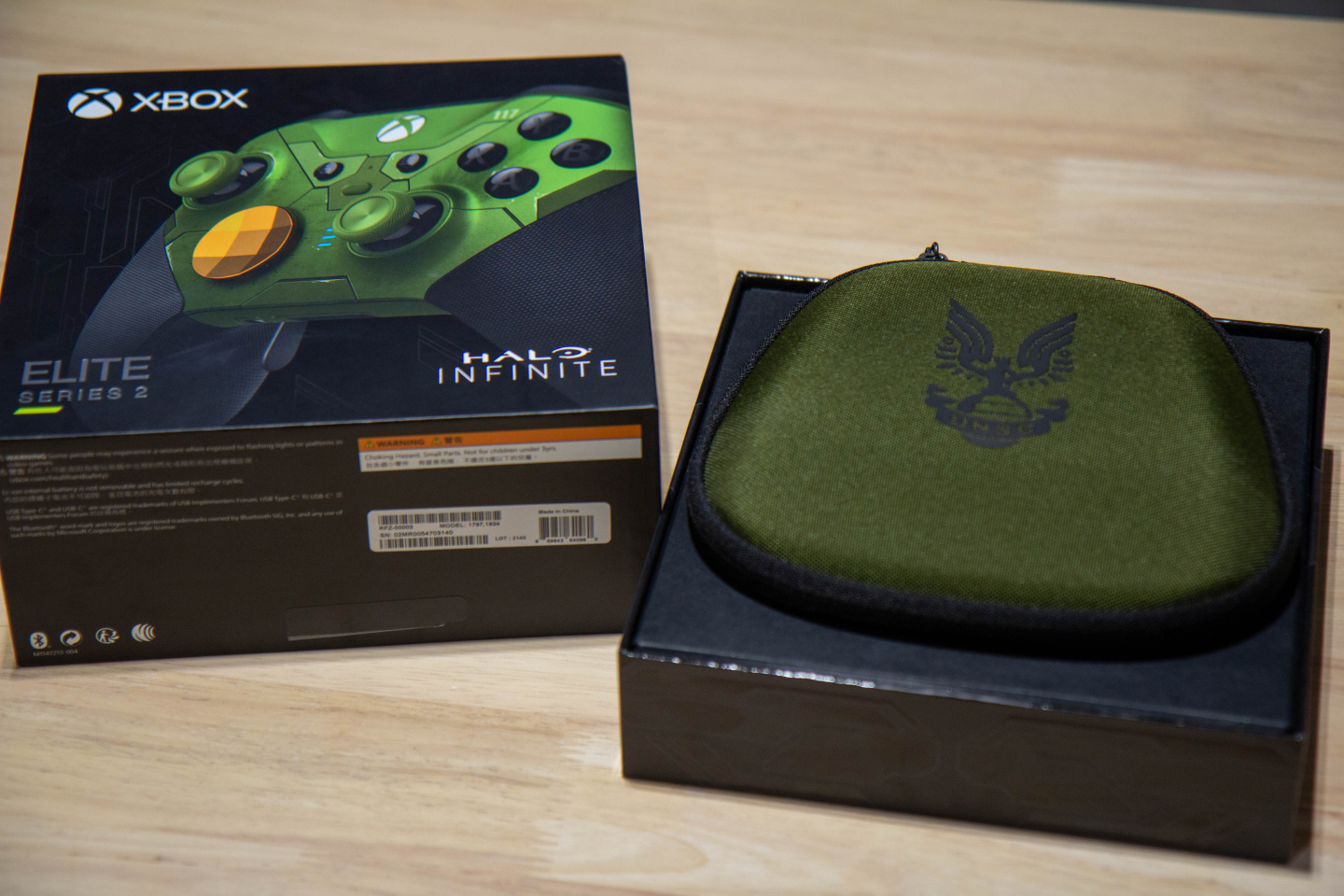 「Xbox Elite 無線控制器 Series 2 - Halo Infinite 限量版」以《最後一戰》系列英雄士官長的造型為主題設計,斯巴達超級戰士護甲的軍綠色主體以及面罩的金色方向鍵,搭配可調整張力的搖桿 ,以及較短的高感應發射鍵鎖,特製的環繞式橡膠握把,並按照金色風格重新製作的零件。