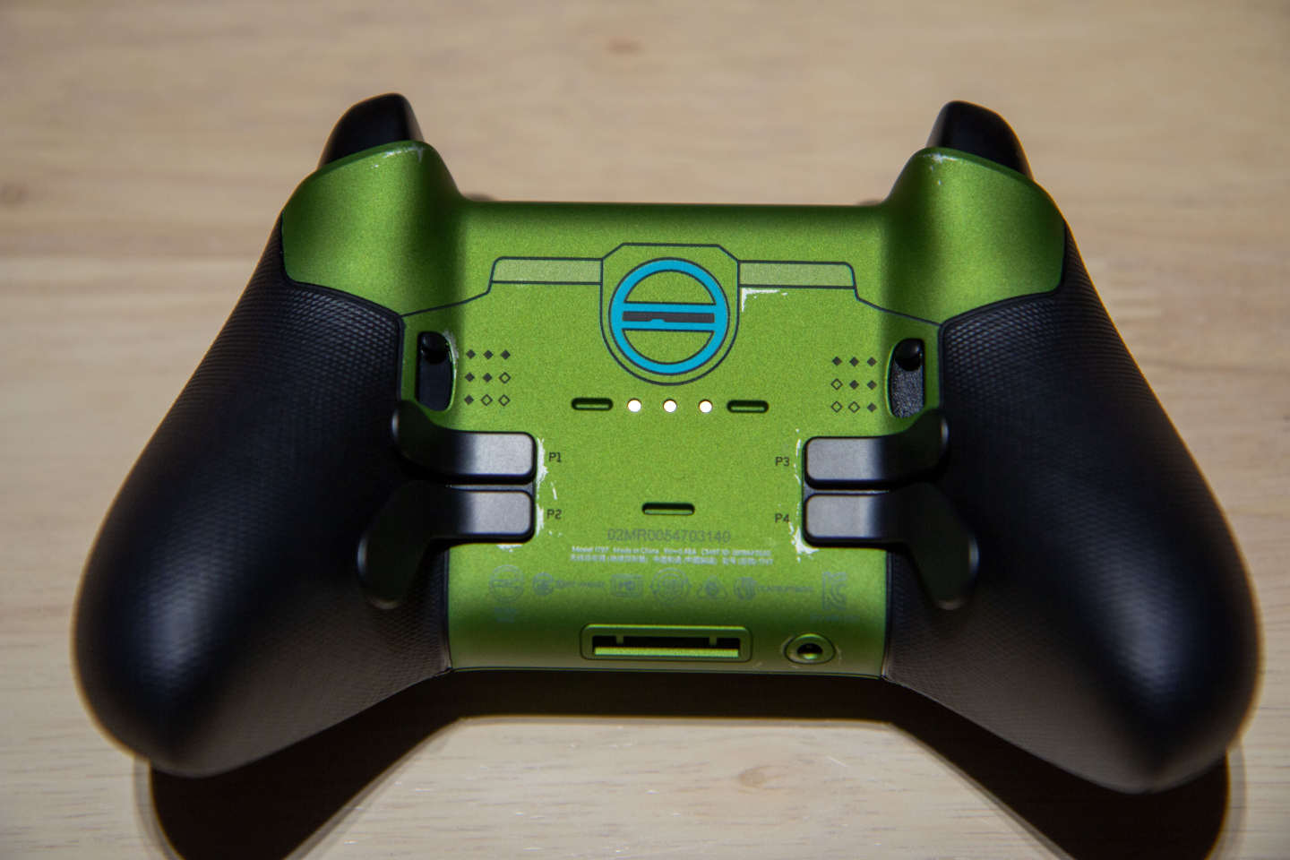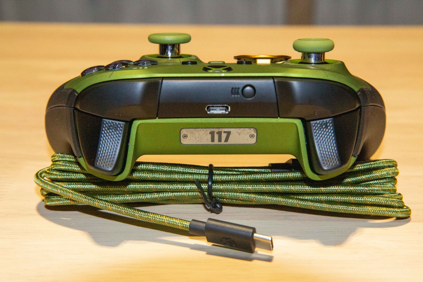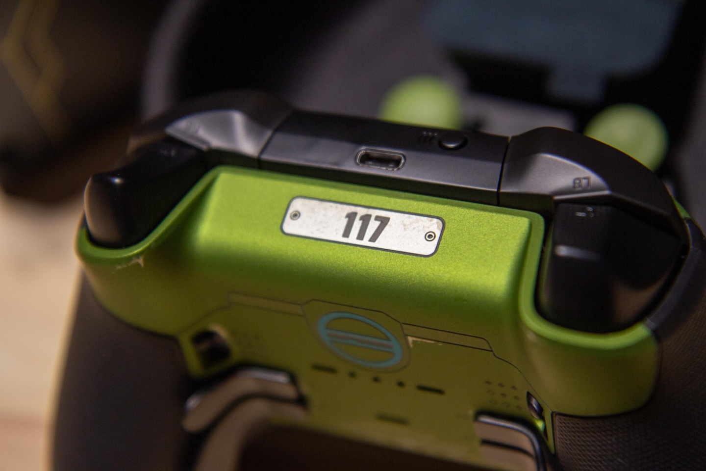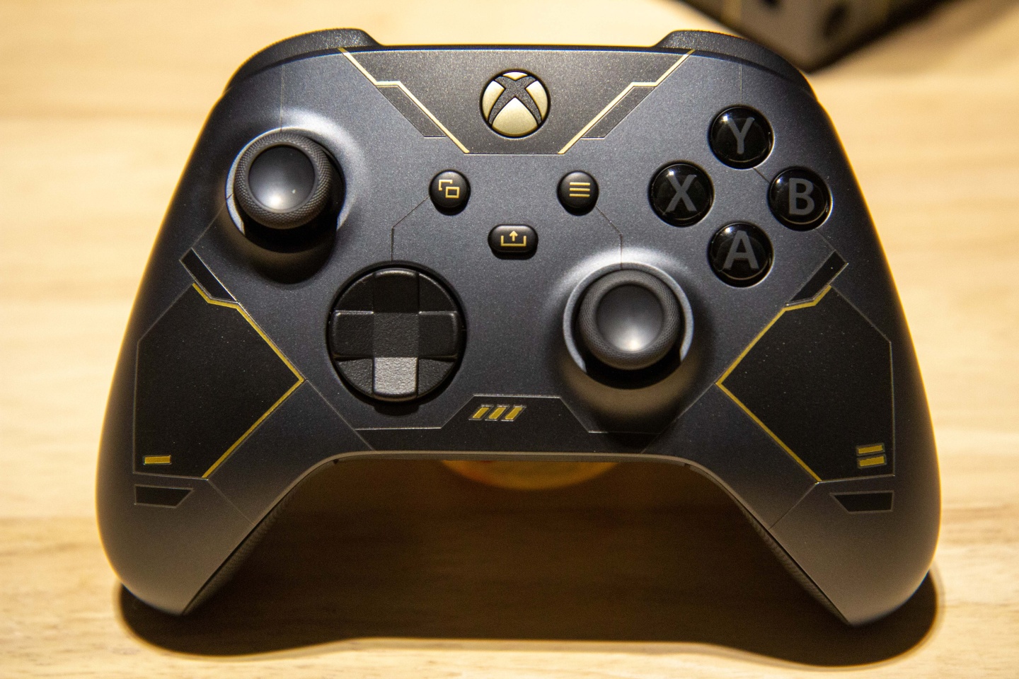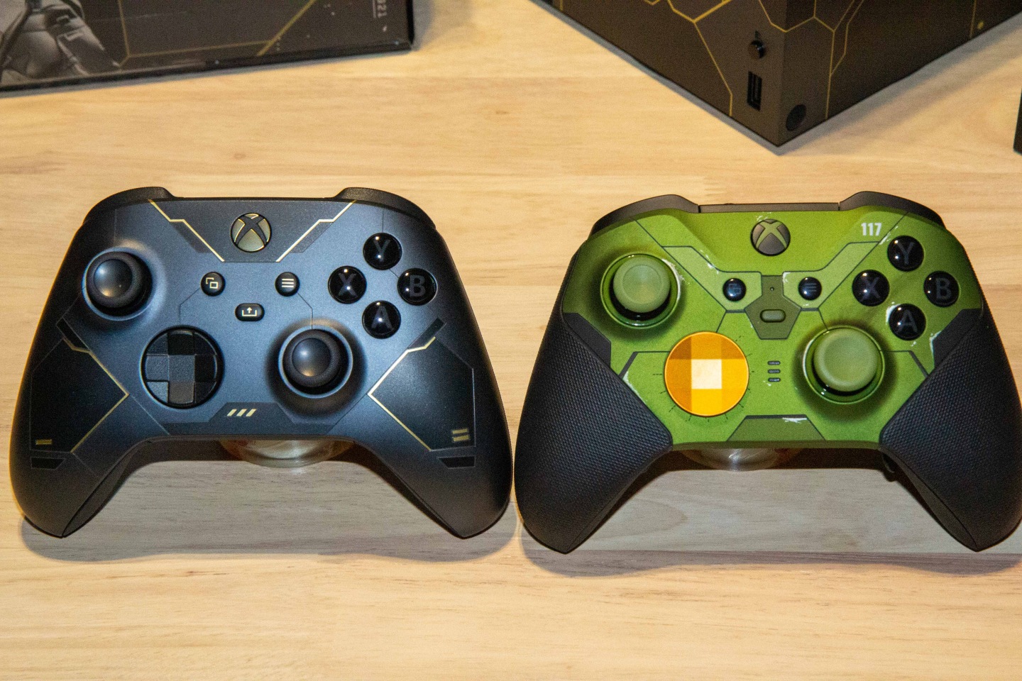 「Xbox Elite 無線控制器 Series 2 - Halo Infinite 限量版」以《最後一戰》系列英雄士官長的造型為主題設計,斯巴達超級戰士護甲的軍綠色主體以及面罩的金色方向鍵,搭配可調整張力的搖桿 ,以及較短的高感應發射鍵鎖,特製的環繞式橡膠握把,並按照金色風格重新製作的零件。