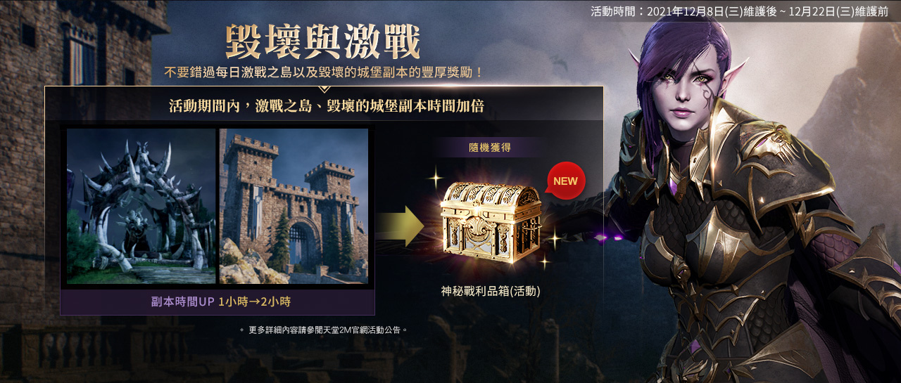 【毀壞與激戰】:12/8 維護後~12/22 維護前,活動期間內,「激戰之島」與「毀壞的城堡」副本時間加倍至 2 小時,在激戰之島與毀壞的城堡副本內,可隨機獲得「神秘戰利品箱(活動)」。