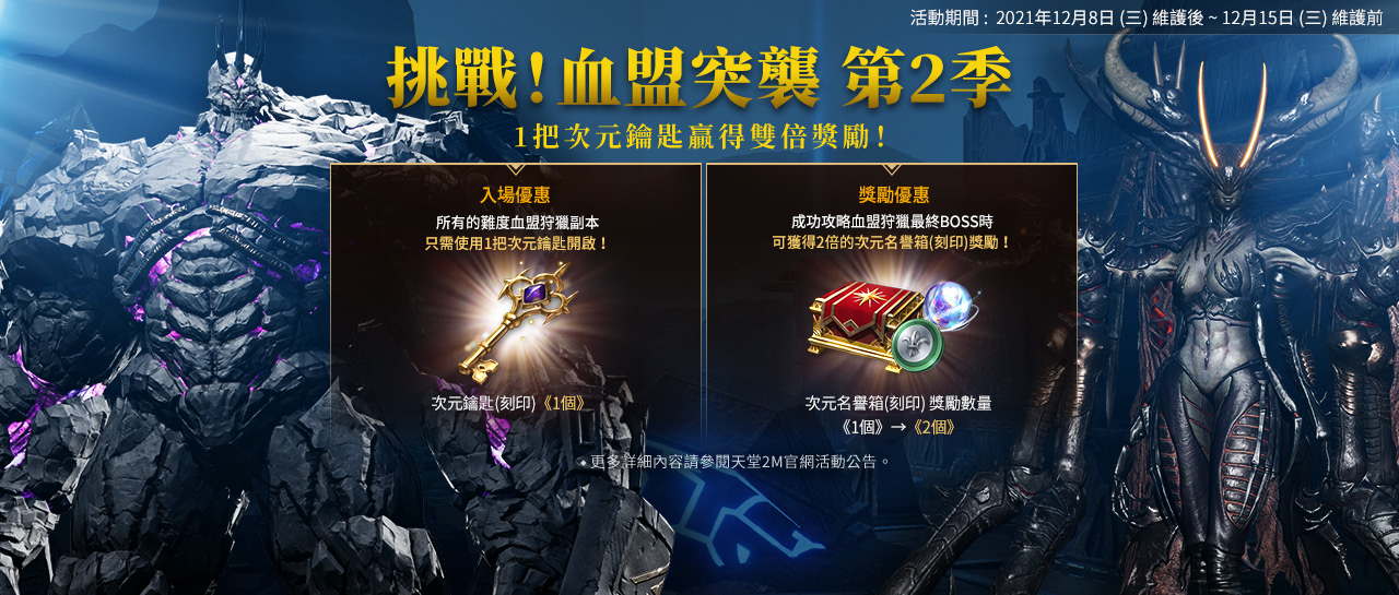 【挑戰!血盟突襲第2季】:12/8 維護後~12/15 維護前,活動期間內,所有難度的血盟狩獵副本,只需使用1把次元鑰匙開啟,成功攻略血盟狩獵最終 BOSS 時,可獲得 2 倍的次元名譽箱(刻印)獎勵。