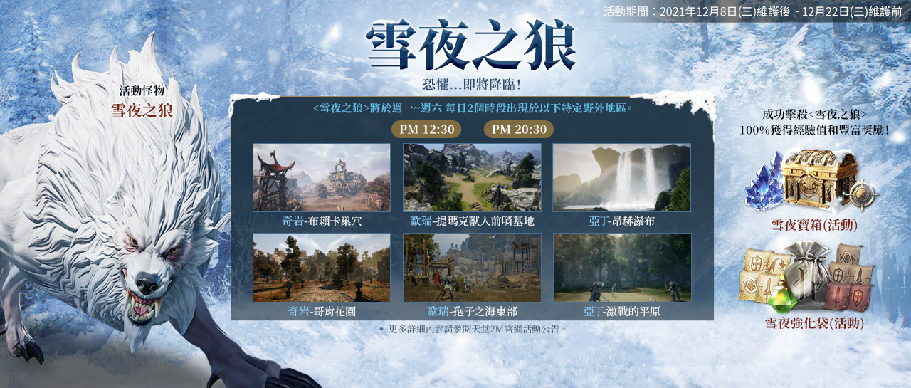 【雪夜之狼】:12/8 維護後~12/22 維護前,「雪夜之狼」將於週一~週六每日中午 12:30 以及晚上 20:30,出現在特定野外地區,成功擊殺「雪夜之狼」可 100% 獲得經驗值以及豐富獎勵,包含「雪夜寶箱(活動)、雪夜強化袋(活動)」。