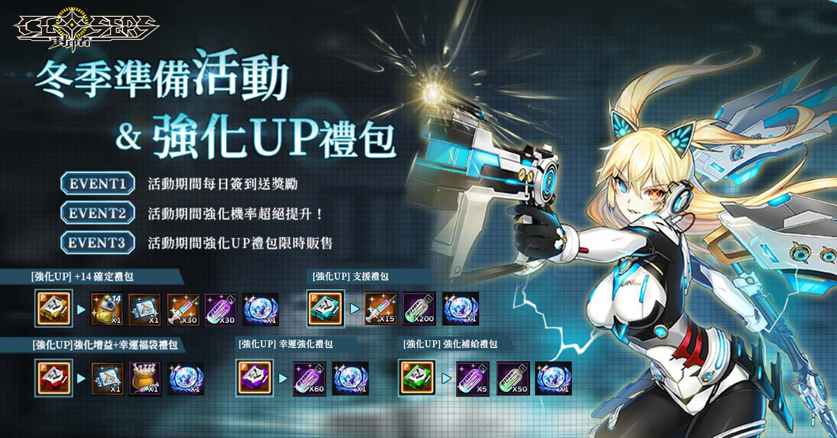 配合露西最高等級擴張,本次改版官方推出的好禮活動包含「露西最高等級擴張活動」、「冬季準備紀念活動」、「辛強高中簽到簿更新」以及「D伯爵的成長支援箱子」。特工於活動期間內登入簽到即可獲得實用好禮,如「S 確定 D 零件 : 裝備」、「貢獻度 +1000」、「α重鑄等化器」等等。同時,只要使用露西通過指定副本完成任務,更可獲得「真實鉑金驅動器」、「作戰區域免費票選擇箱子 ver.1.2」、「釜山漏洞塊支援箱子」、「汙染超能之海支援箱子」、「寵物核心」等多項好禮,特工們敬請把握時間領取獎勵!更多精彩內容,請詳見官方網站及粉絲團公告。