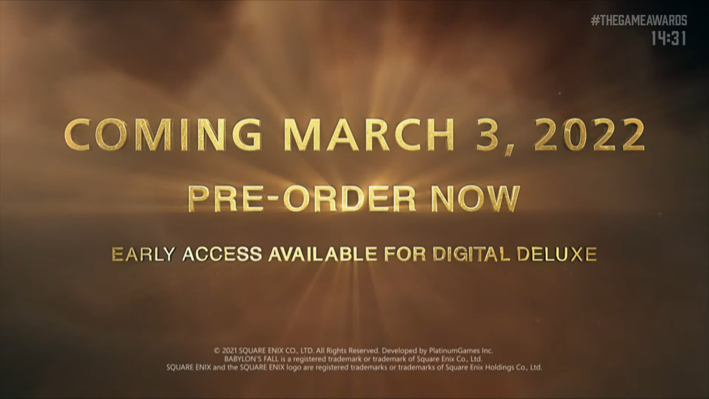 SQUARE ENIX 在 The Game Awards 2021 遊戲大獎頒獎典禮上宣布,白金工作室開發中動作遊戲新作《巴比倫的殞落》BABYLON'S FALL)》主機版本將於 2022 年 3 月 3 日發售,Steam 版為 3 月 4 日。