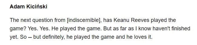 由於 CD Projekt RED 在去年公布決算時,社長兼 CEO「Adam Kiciński(亞當.季辛斯基)」曾經提到,基努李維在玩過遊戲後,表示自己非常喜歡遊戲;對照這次基努李維在訪談中的否認,可說是被硬生生打臉,也讓玩家因此譁然。