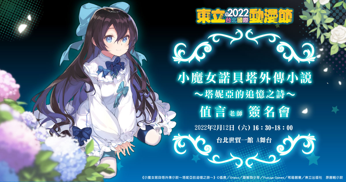 東立出版社即將於 2022 年台北國際動漫節 2 月 12 日(六)舉辦《小魔女諾貝塔外傳小說~塔妮亞的追憶之詩~》值言老師簽名會。值言是臺灣知名輕小說作家,角川國際動漫輕小說課程主要講師,曾榮獲多次小說獎項,並跨足編劇、遊戲腳本、漫畫原作、IP 改編等領域,出版經驗豐富。代表作品有《在戀愛遊戲中死掉,就再也沒辦法復活了喔!》、《終身保固的女僕與容易崩壞的我》、《美味的異世界料理,需要加點龍》等。
