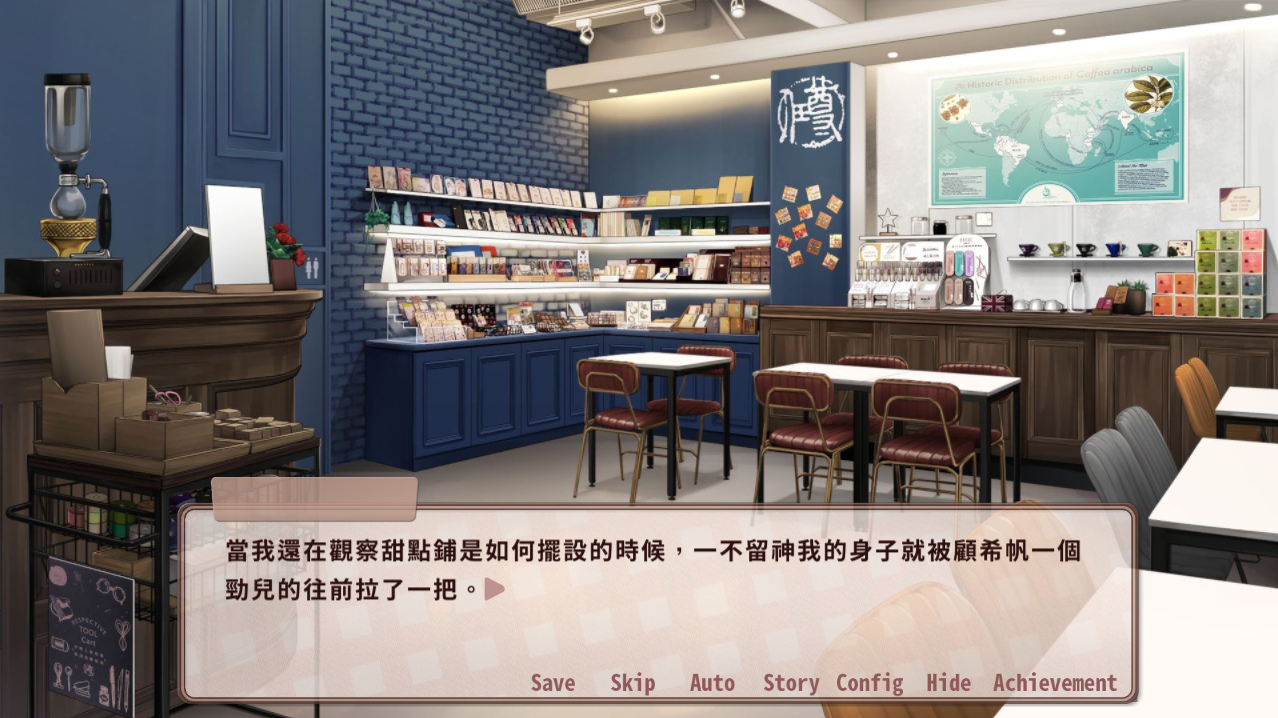 遊戲的進行方式以動態小說為主,偶爾有觸發事件的分歧選項,另一部分就是蒐集跟咖啡相關的小道具解鎖咖啡小知識,以及將角色點單的咖啡,選擇符合該角色喜歡的風味和口感的咖啡豆,進行選擇濾杯及沖泡手法的小遊戲,對於喜歡享受劇情的玩家來說是相當親切的玩法,不想因為小遊戲打擾的話還可以選擇跳過。在小遊戲過程中沒有規定沖泡時間,基本上已經是毫無失敗機會可言,想要玩出不同感覺的玩家可能會覺得滿乏味的,不如還是將目光放在解鎖戀愛故事主線上吧。
