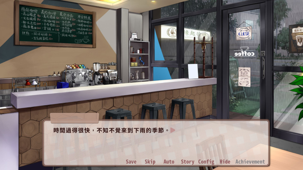 故事的舞台座落在台南,玩家扮演名為吳俞恆的大學生,在父母出國雲遊的期間與店長一起經營父母開設的咖啡廳「緣起彼時」,從小就對咖啡耳濡目染的俞恆,雖然有一套自己的咖啡哲學,但依舊對於繼承父母的味道有些疑慮,並且也正在嘗試尋找破口。在雨季開始之時,一個渾身濕透的女孩──顧希帆,踏入了緣起彼時,也將兩人的緣分順勢牽起。故事劇情以兩人的相識為開端,輔以其他角色:俞恆的童年玩伴張佐齊、路過的網紅陳郁穎、打工店員郭千菱、何孟宣、周彥翔、店長王文延、俞恆的姊姊吳思樺,交織了一部訴說未來願景、碰壁不安、實踐夢想,也有戀愛的酸澀和放下執著勇敢向前的群像劇。