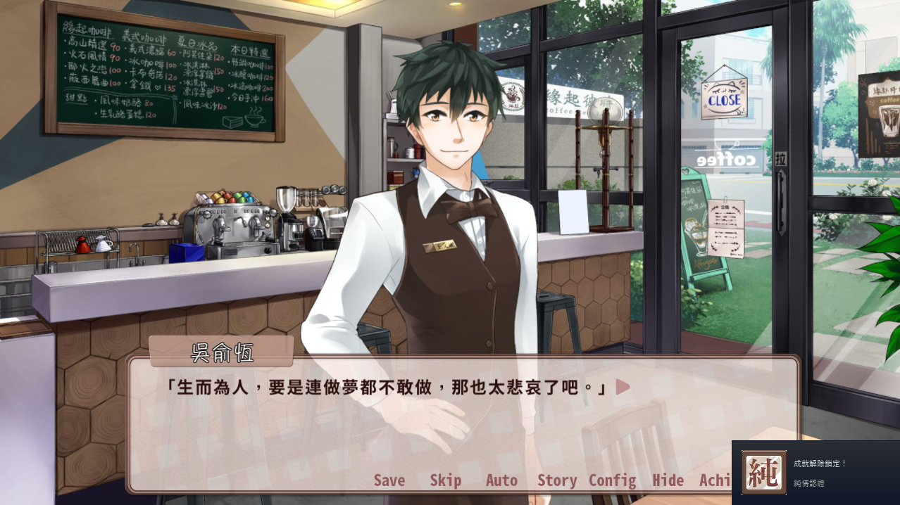 整體體驗到第七章為止,編輯對背景音樂和音效給予滿大的好評,使用在咖啡廳會出現的輕鬆 Bassa Nova 音樂,還未開始進入遊戲就已經有八分在咖啡廳的氣氛,要是這時候自己也沖一杯咖啡放在旁邊,氣氛一定更加還原。而對白配音部分更是盡量一人一角,以全語音的方式呈現,女角們的聲音和演技都相當不錯,可以分得出來角色們的個性;男角們除了冷靜的俞恆和好動的佐齊外,彥翔的演出就稍嫌平板了一些,但是不影響故事的進行。劇本方面,在角色們敘說自己的煩惱和給予建議的橋段,其實好像有點太過心靈雞湯和說教,台詞也比較不口語,在聽語音的時候稍嫌尷尬;第七章算是一個角色關係有大轉變的章節,但劇情上也顯得平板了些。倒是滿希望看到周邊角色也能配對,不知道團隊有沒有機會將支線故事收錄在 DLC 中呢?