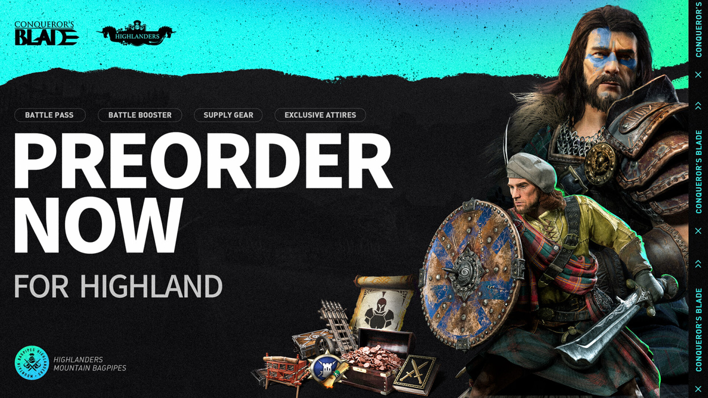 《戰意》(Conqueror’s Blade)以蘇格蘭主題進行歷史模擬的最新賽季「高地:山巔風笛」(Highlanders: Mountain Bagpipes)訂於 12 月 21 日在 Steam、Windows PC 平台全球同步上線。「高地」賽季通行證與兵團預購現正特惠上架中,販售期間可以近 60% 的優惠折扣超值購入。